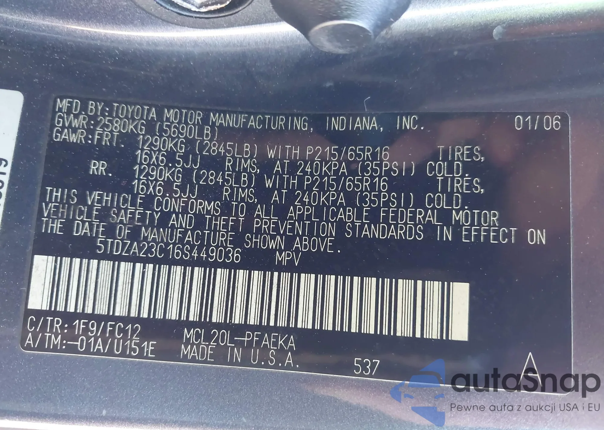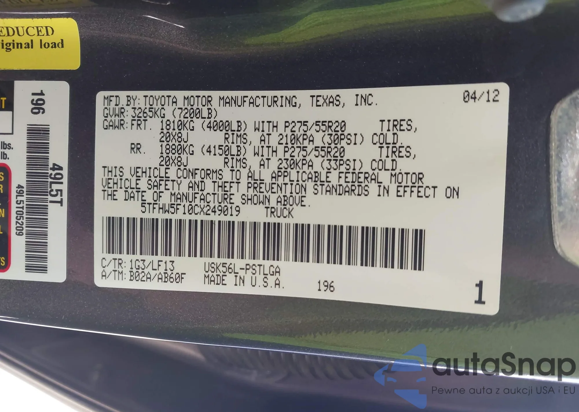 LOT: 43381258 VIN: 5TFHW5F10CX249019