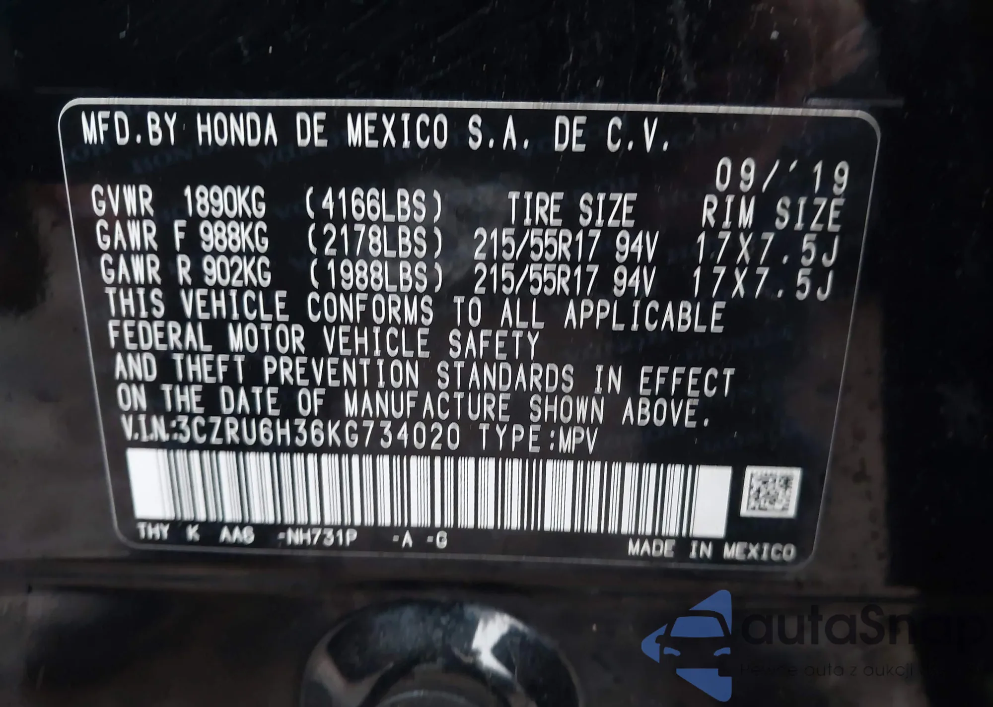 • VIN 3CZRU6H36KG734020