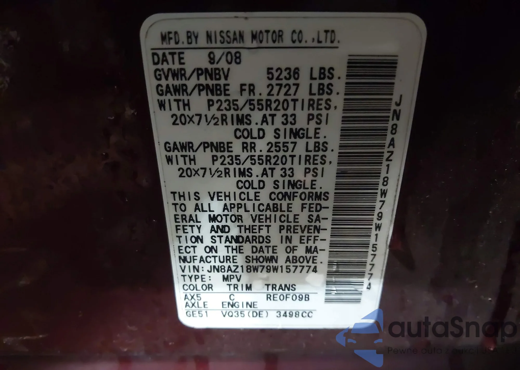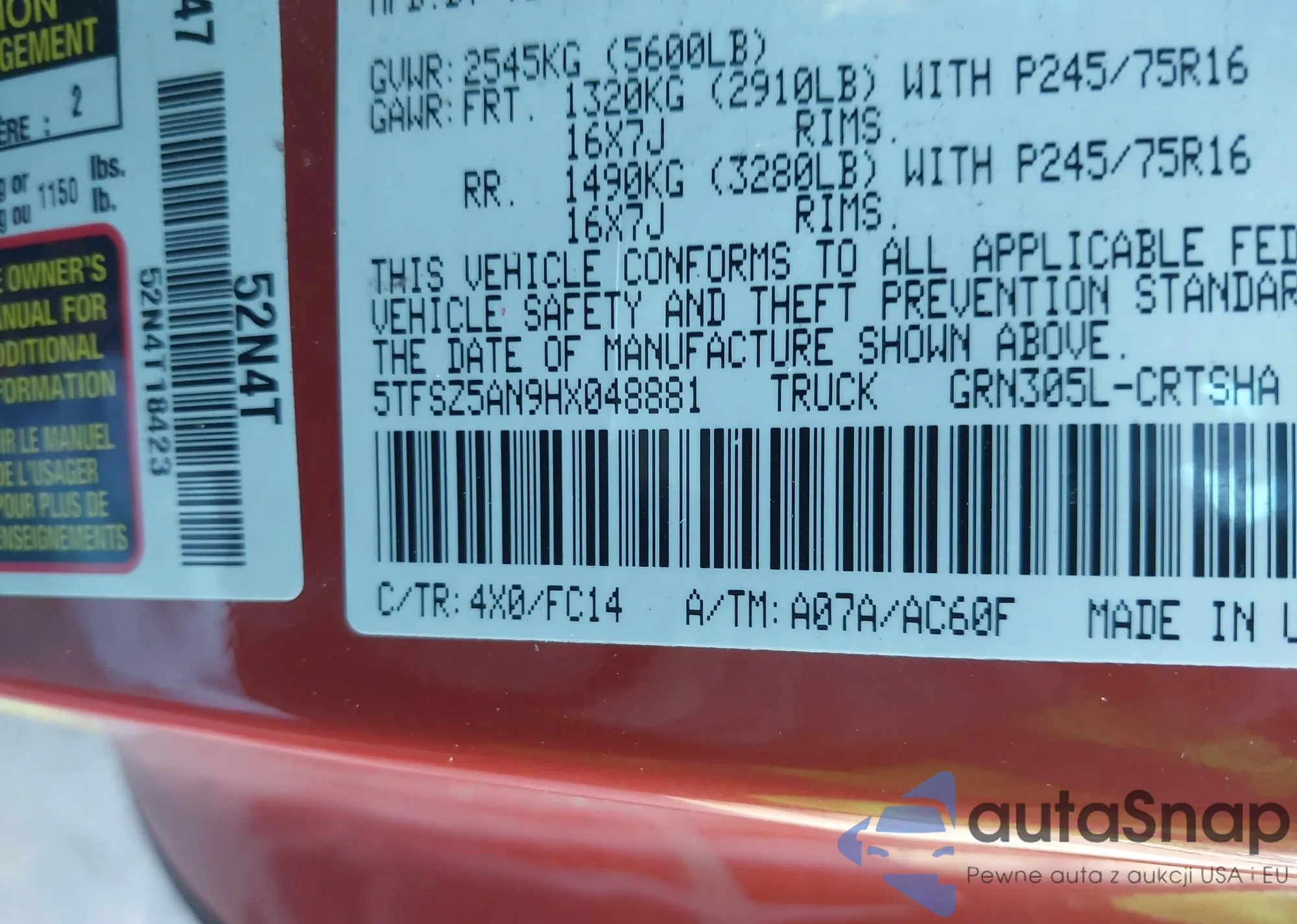 • VIN 5TFSZ5AN9HX048881
