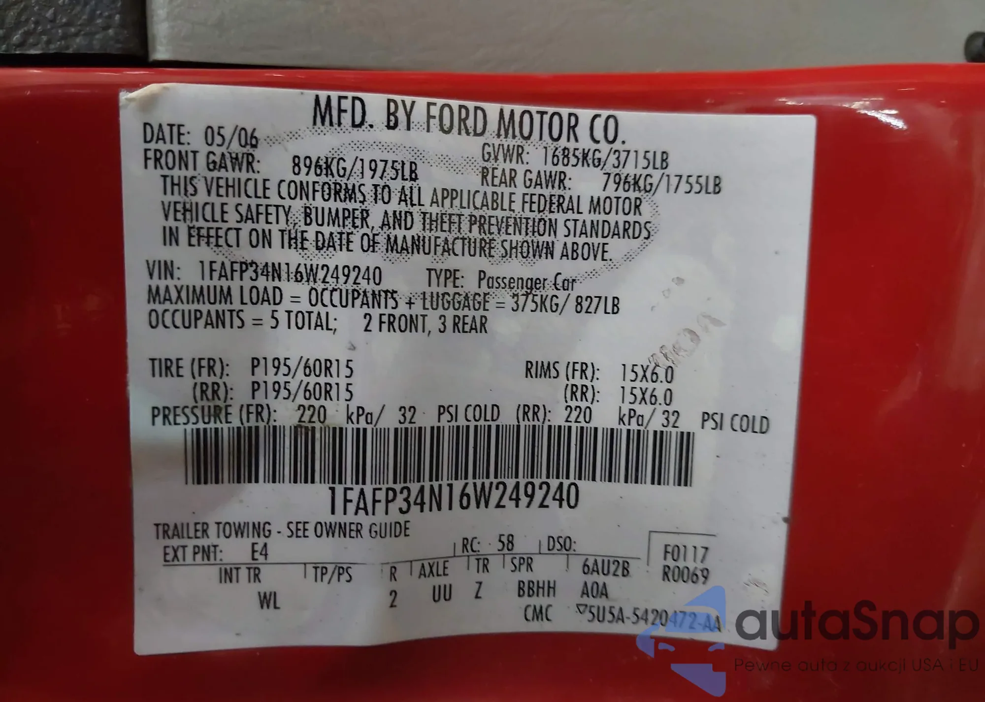LOT: 44143661 VIN: 1FAFP34N16W249240
