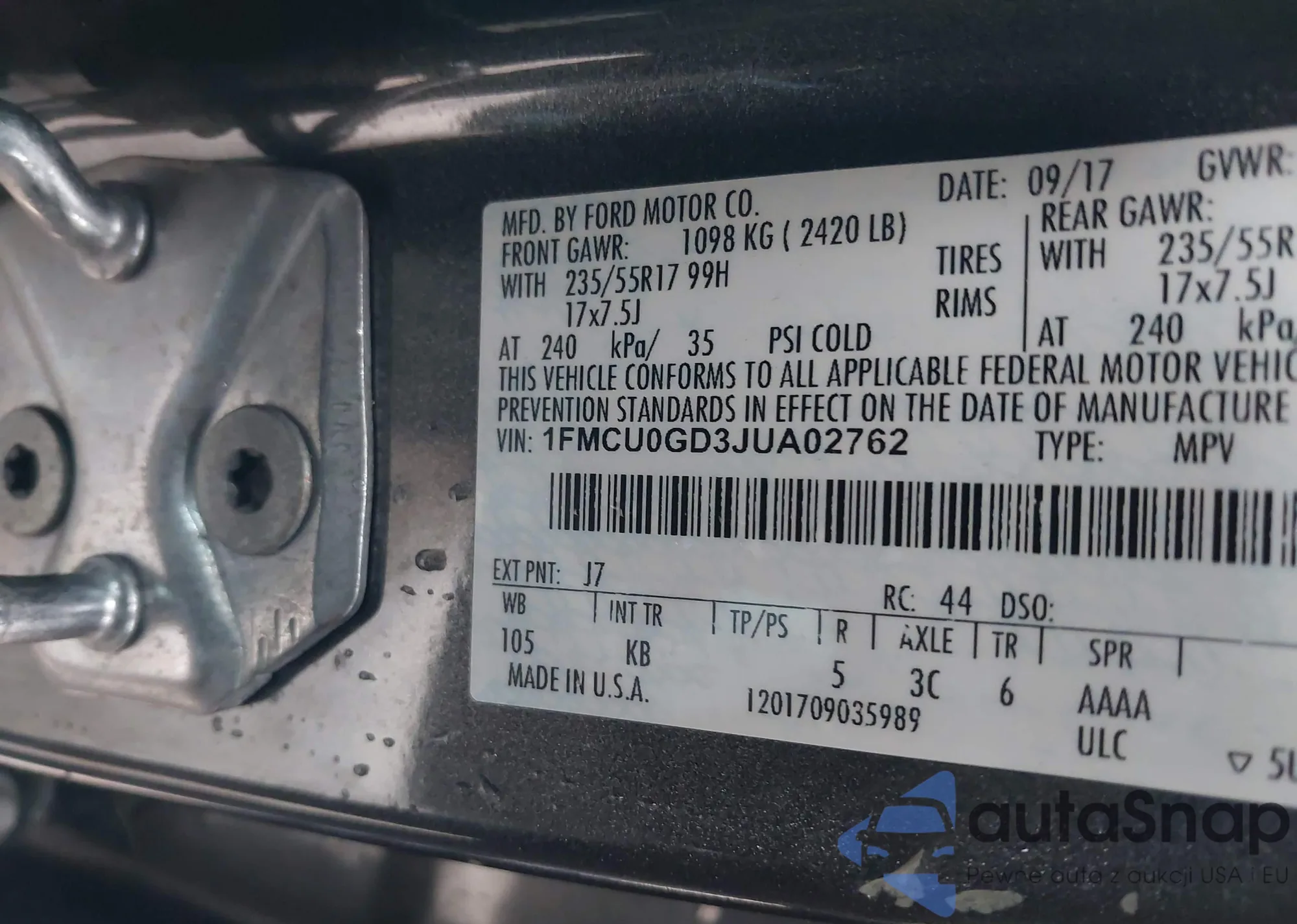 LOT: 43783502 VIN: 1FMCU0GD3JUA02762