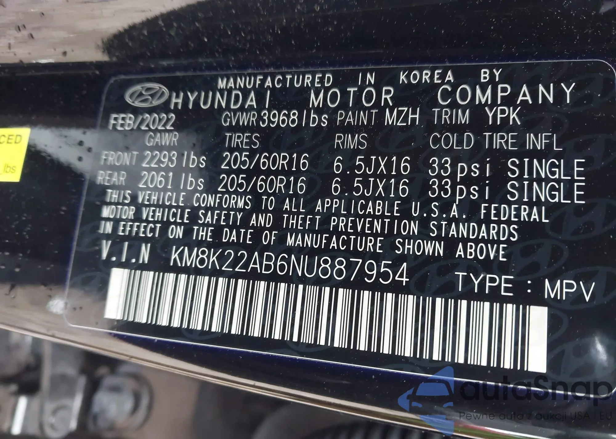 • VIN KM8K22AB6NU887954