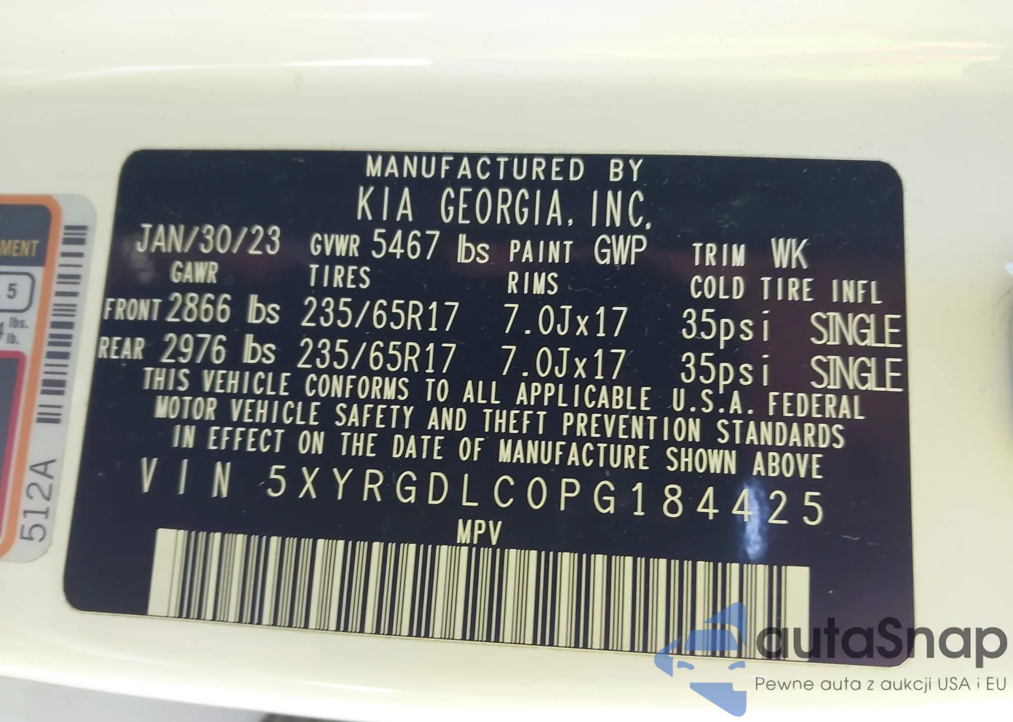 LOT: 43687323 VIN: 5XYRGDLC0PG184425