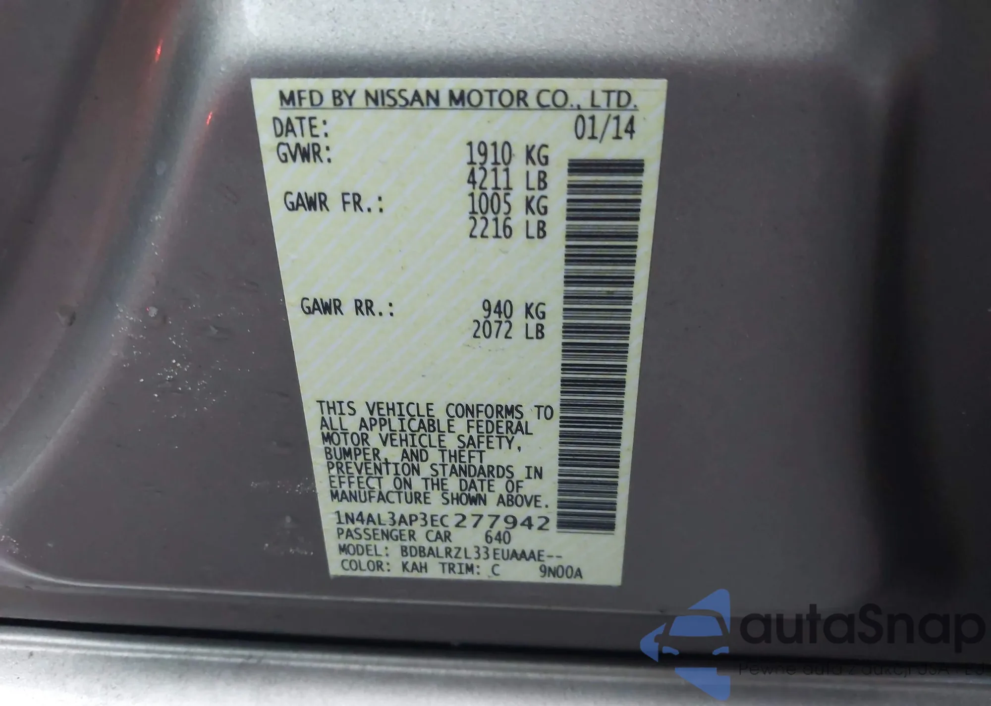 • VIN 1N4AL3AP3EC277942