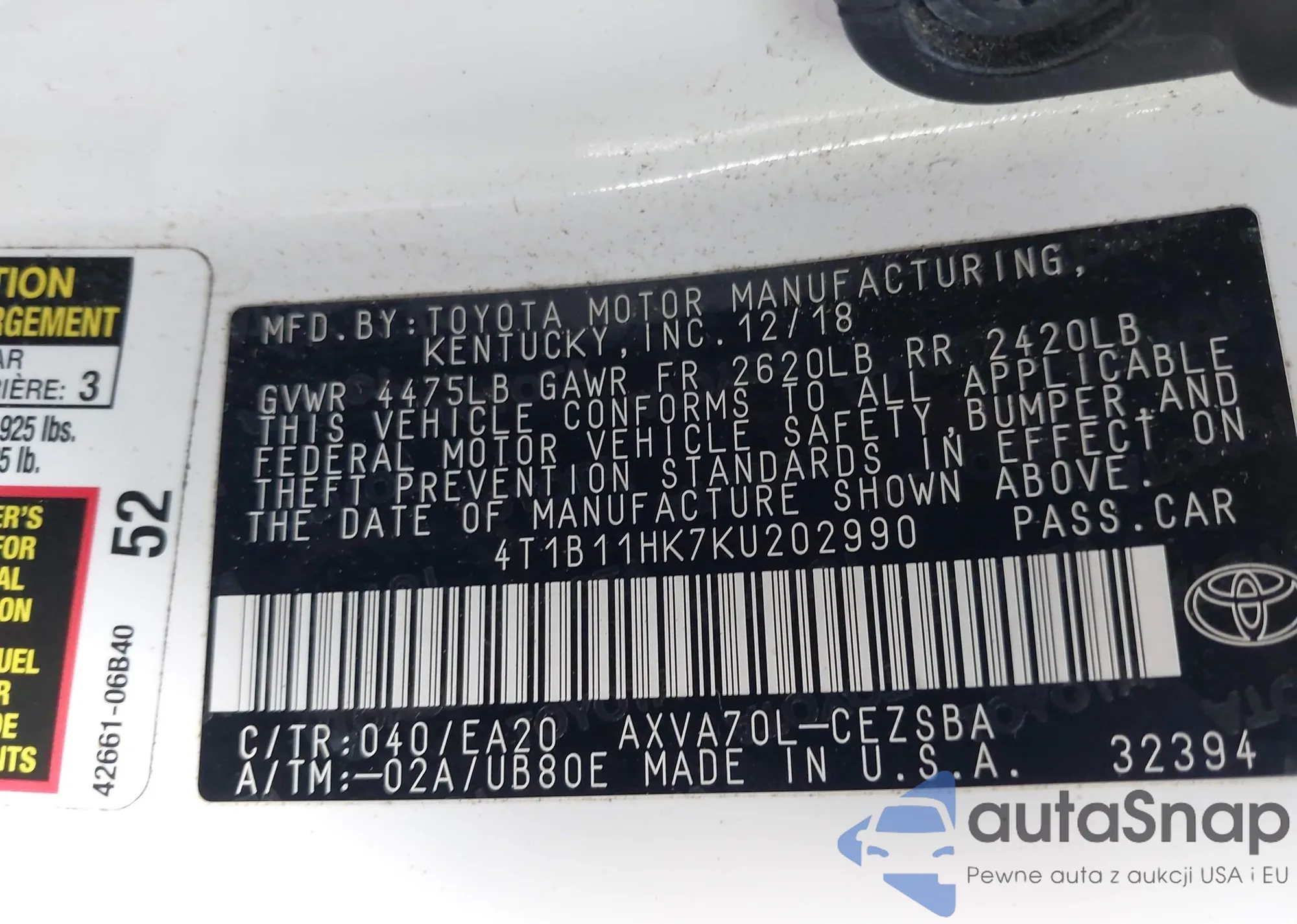 • VIN 4T1B11HK7KU202990