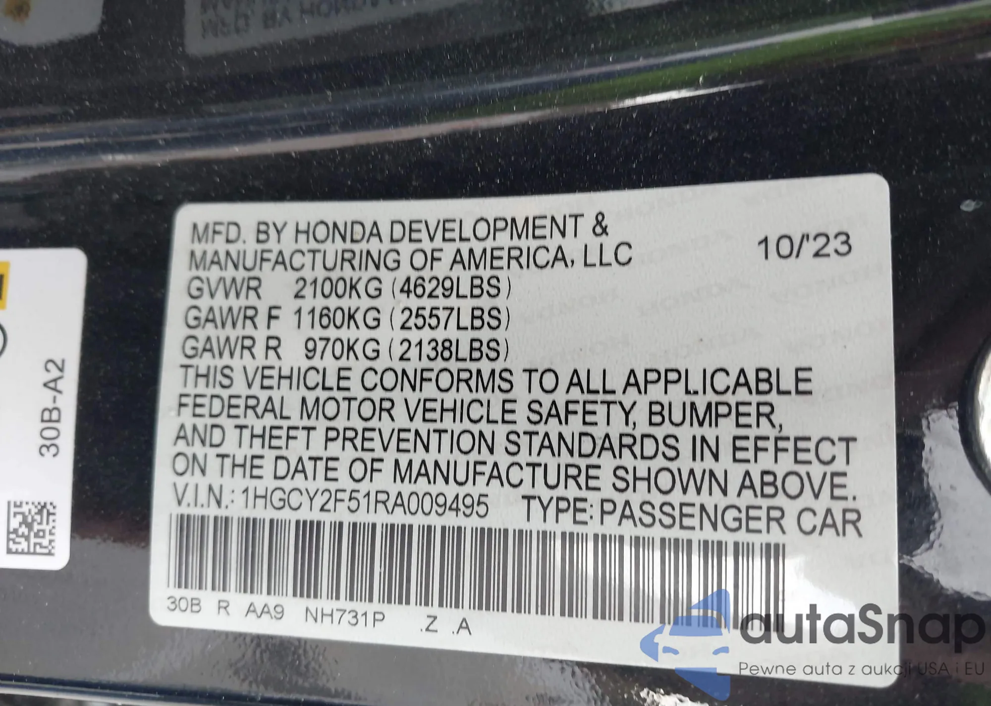 • VIN 1HGCY2F51RA009495