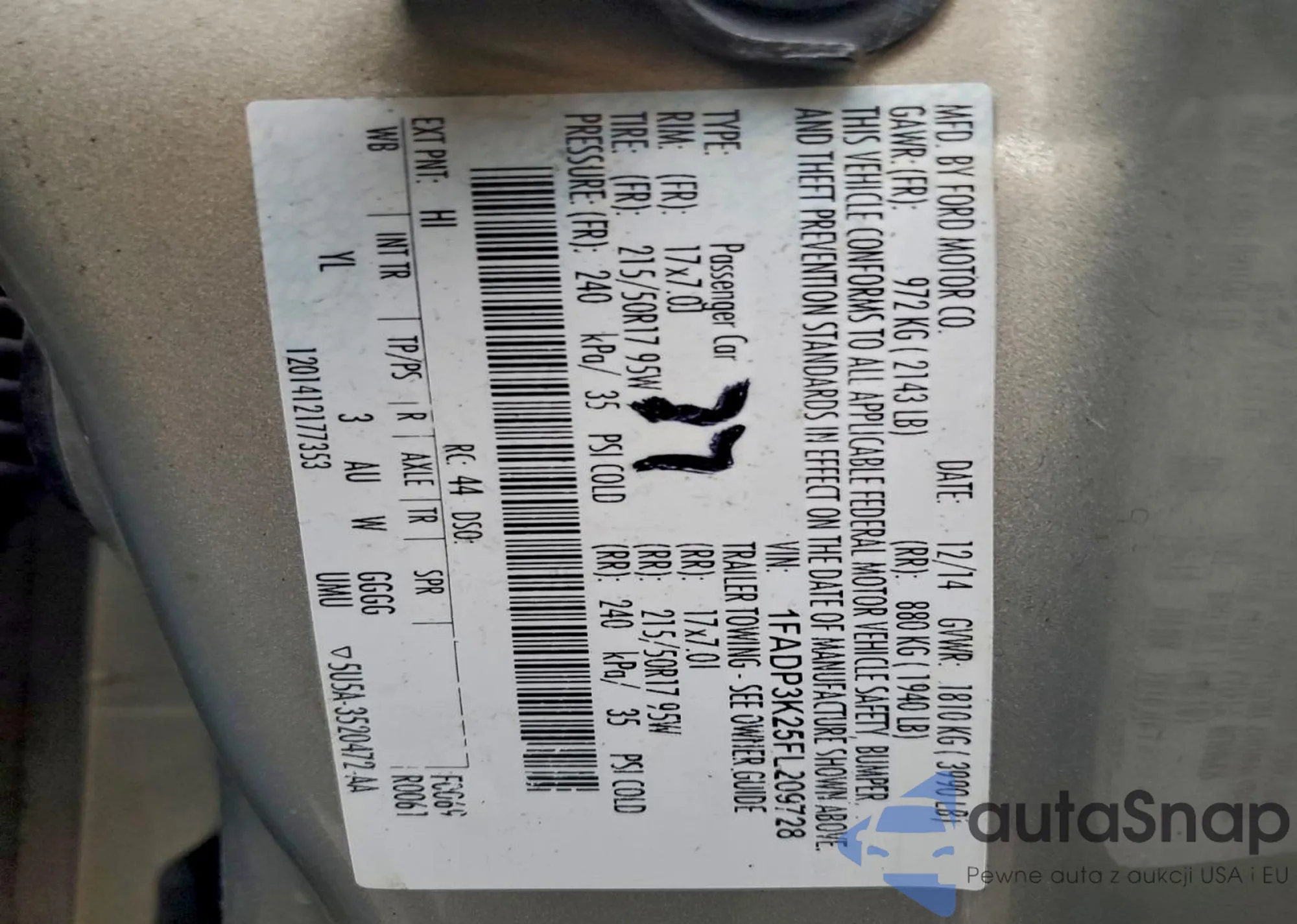 • VIN 1FADP3K25FL209728
