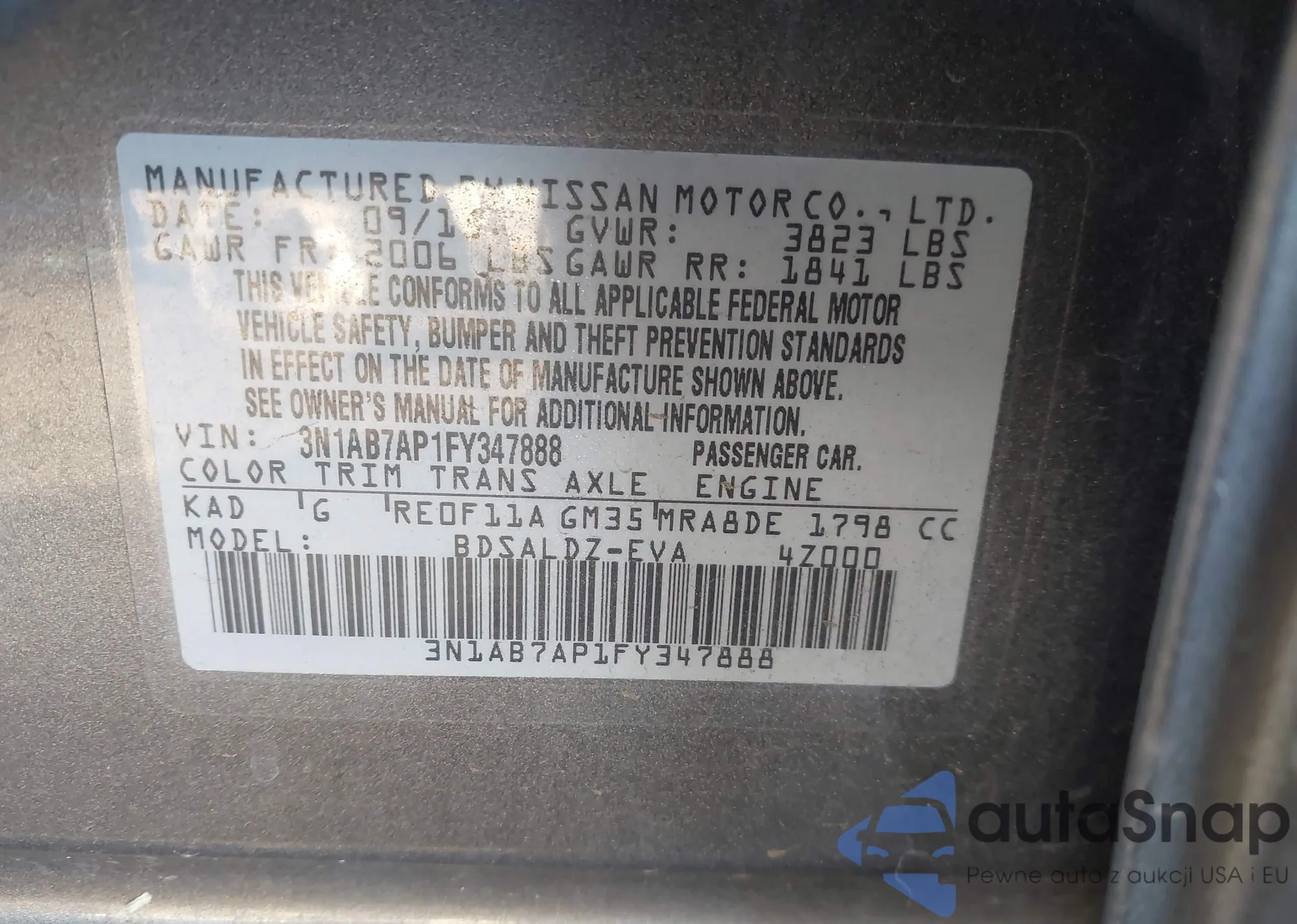 • VIN 3N1AB7AP1FY347888