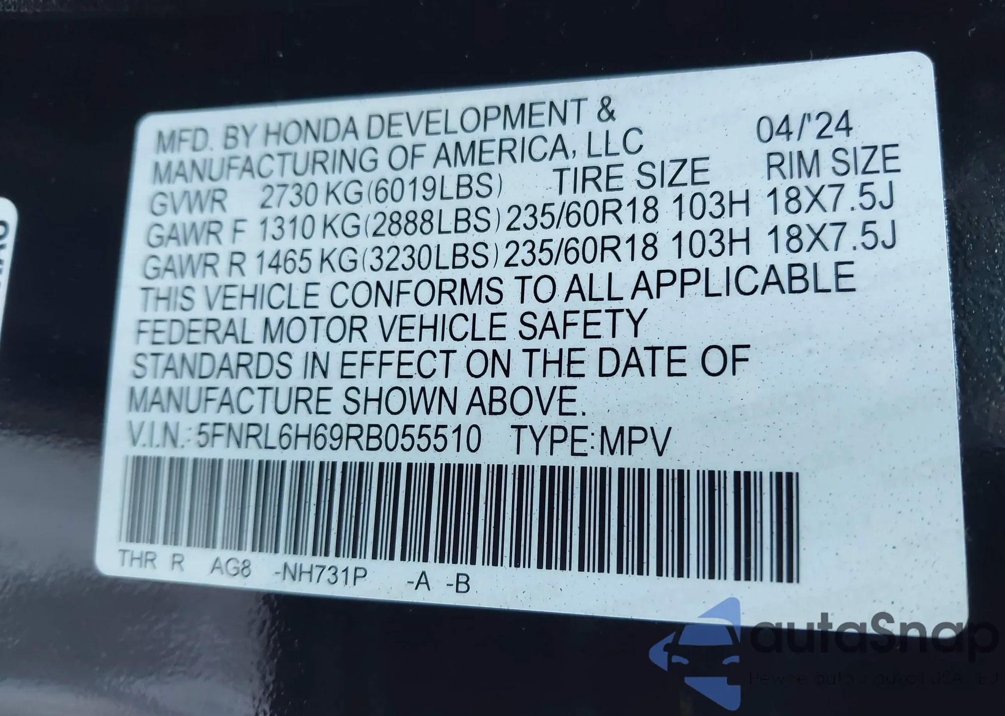 • VIN 5FNRL6H69RB055510