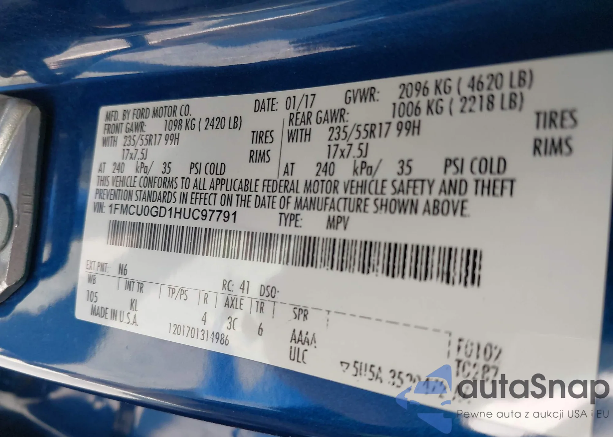 LOT: 43867180 VIN: 1FMCU0GD1HUC97791