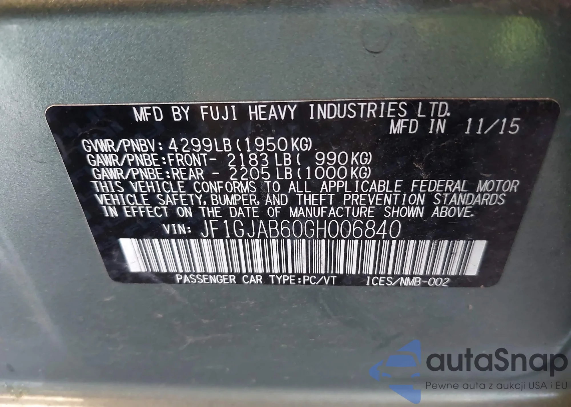LOT: 43905995 VIN: JF1GJAB60GH006840