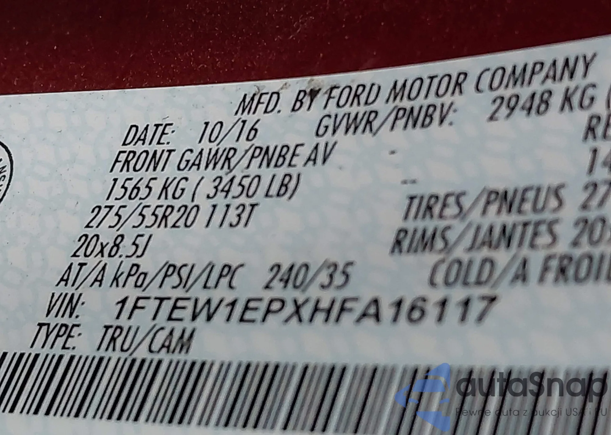 • VIN 1FTEW1EPXHFA16117