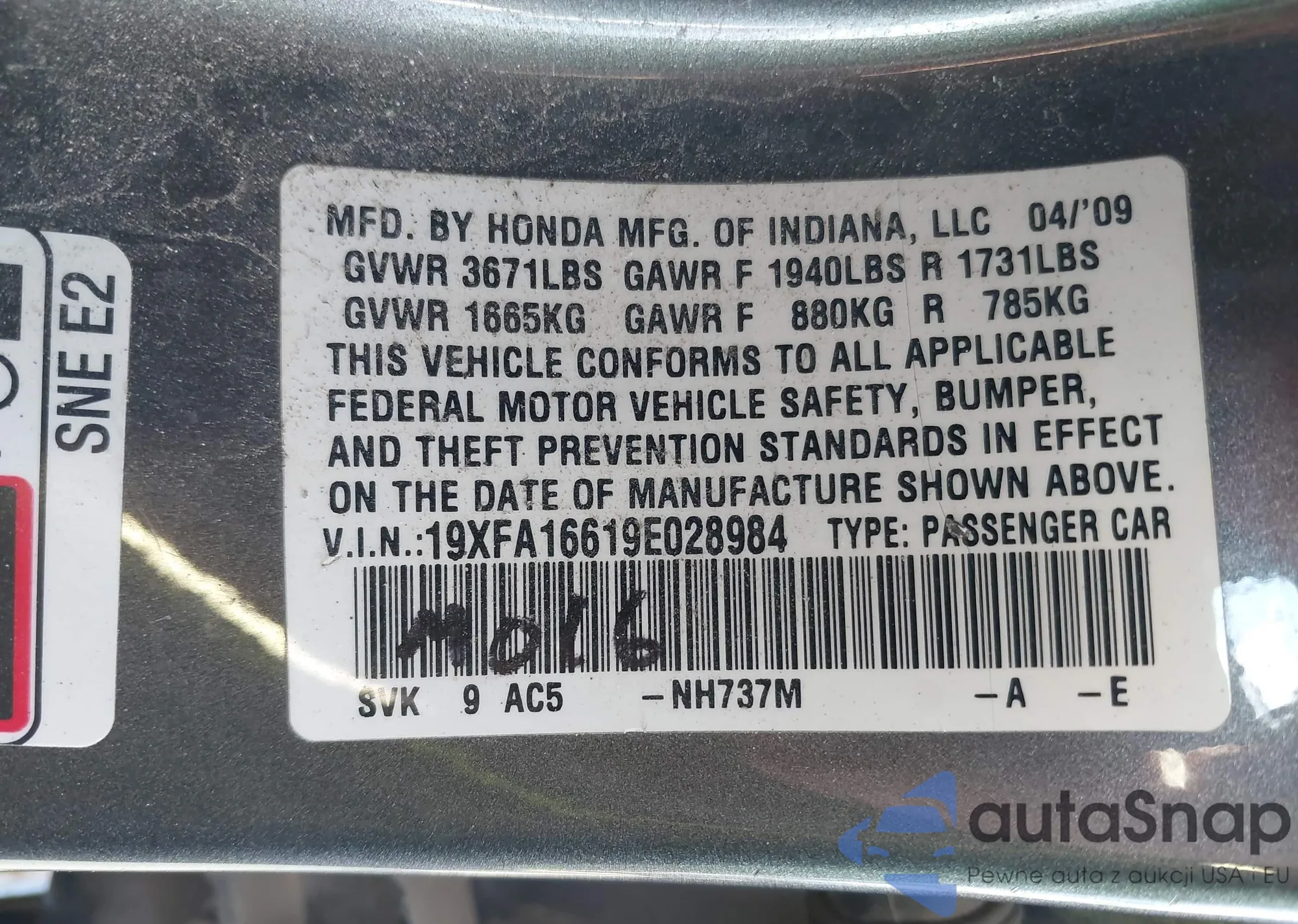 LOT: 44187250 VIN: 19XFA16619E028984