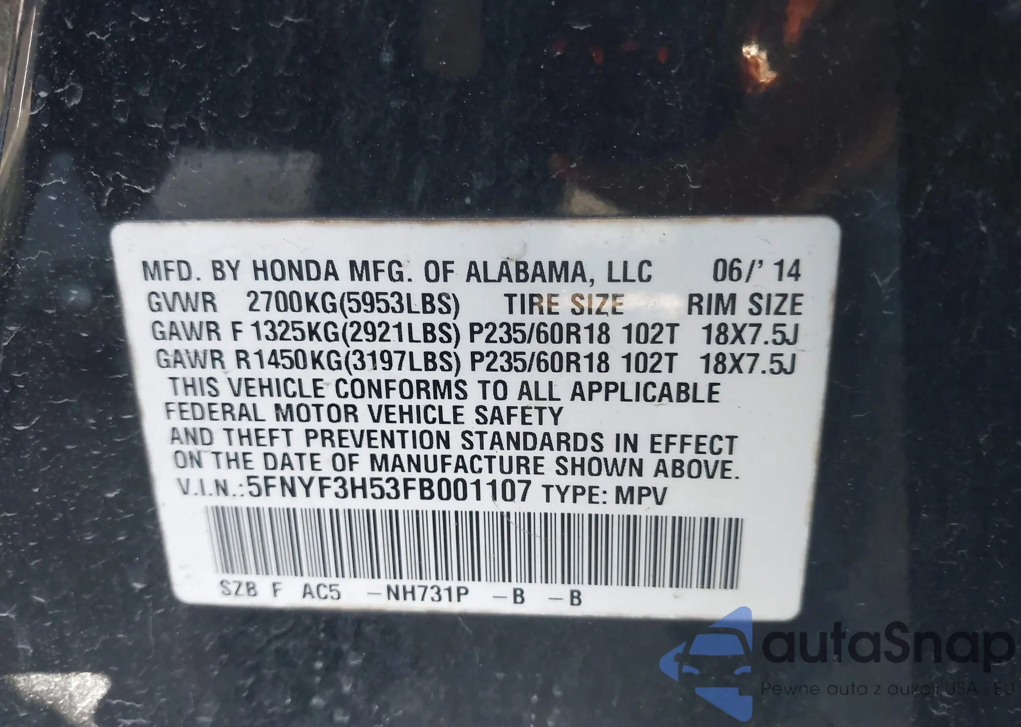 • VIN 5FNYF3H53FB001107