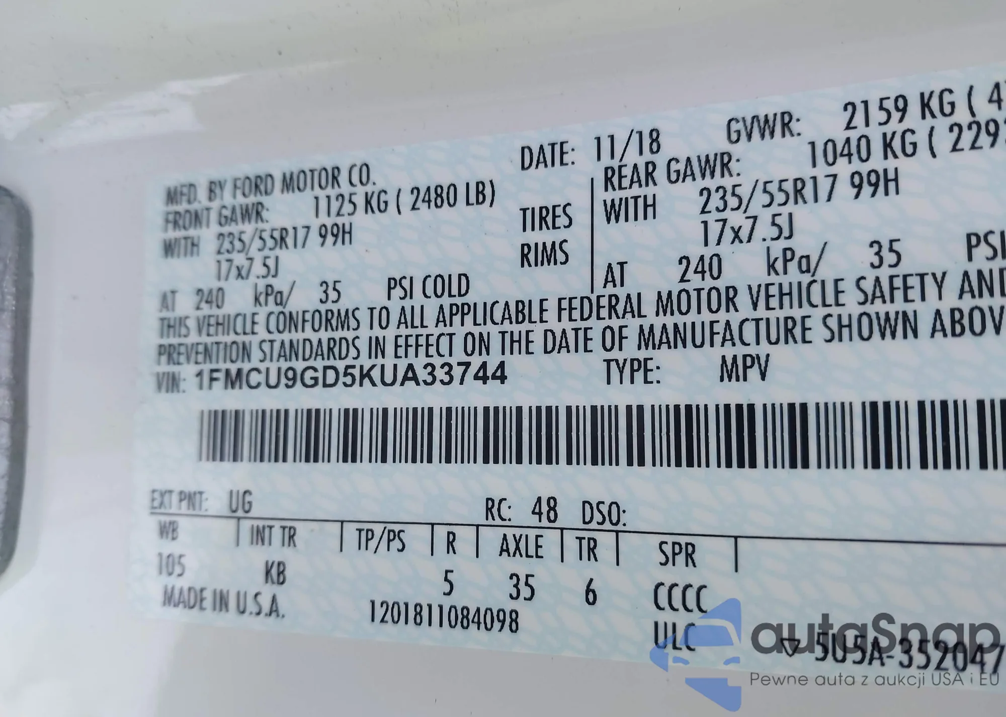 • VIN 1FMCU9GD5KUA33744