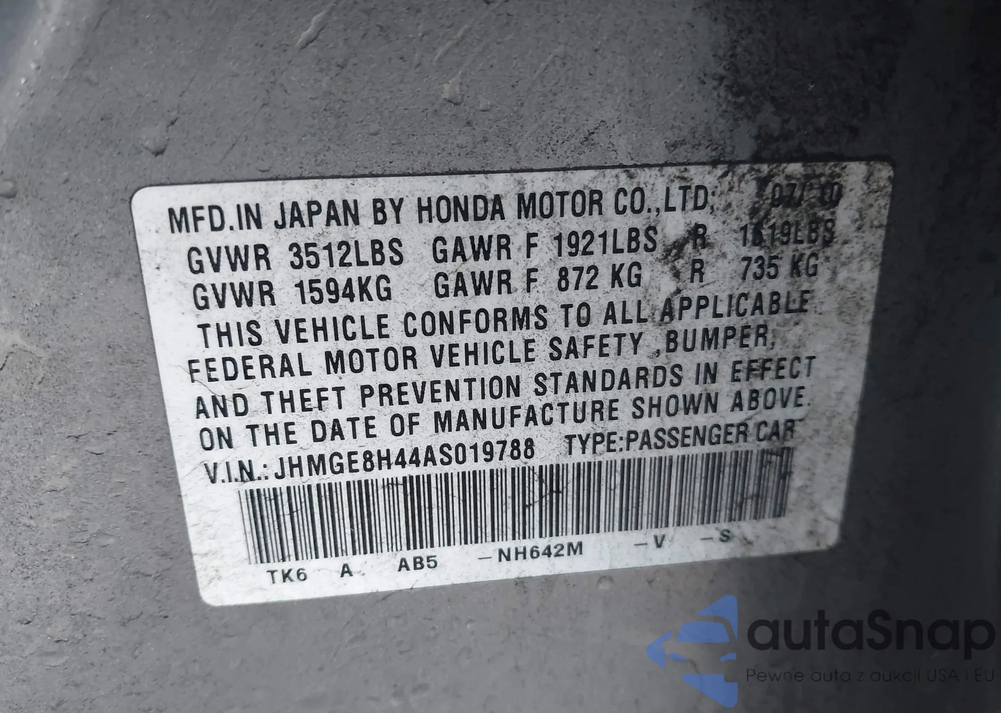 LOT: 44079344 VIN: JHMGE8H44AS019788