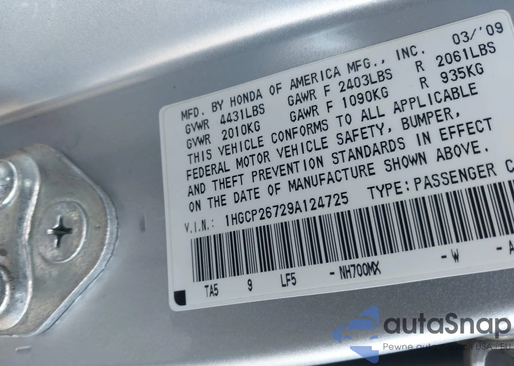 LOT: 44080076 VIN: 1HGCP26729A124725