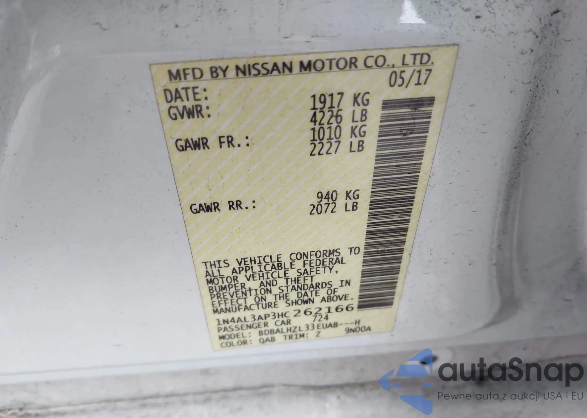 LOT: 44158178 VIN: 1N4AL3AP3HC262166