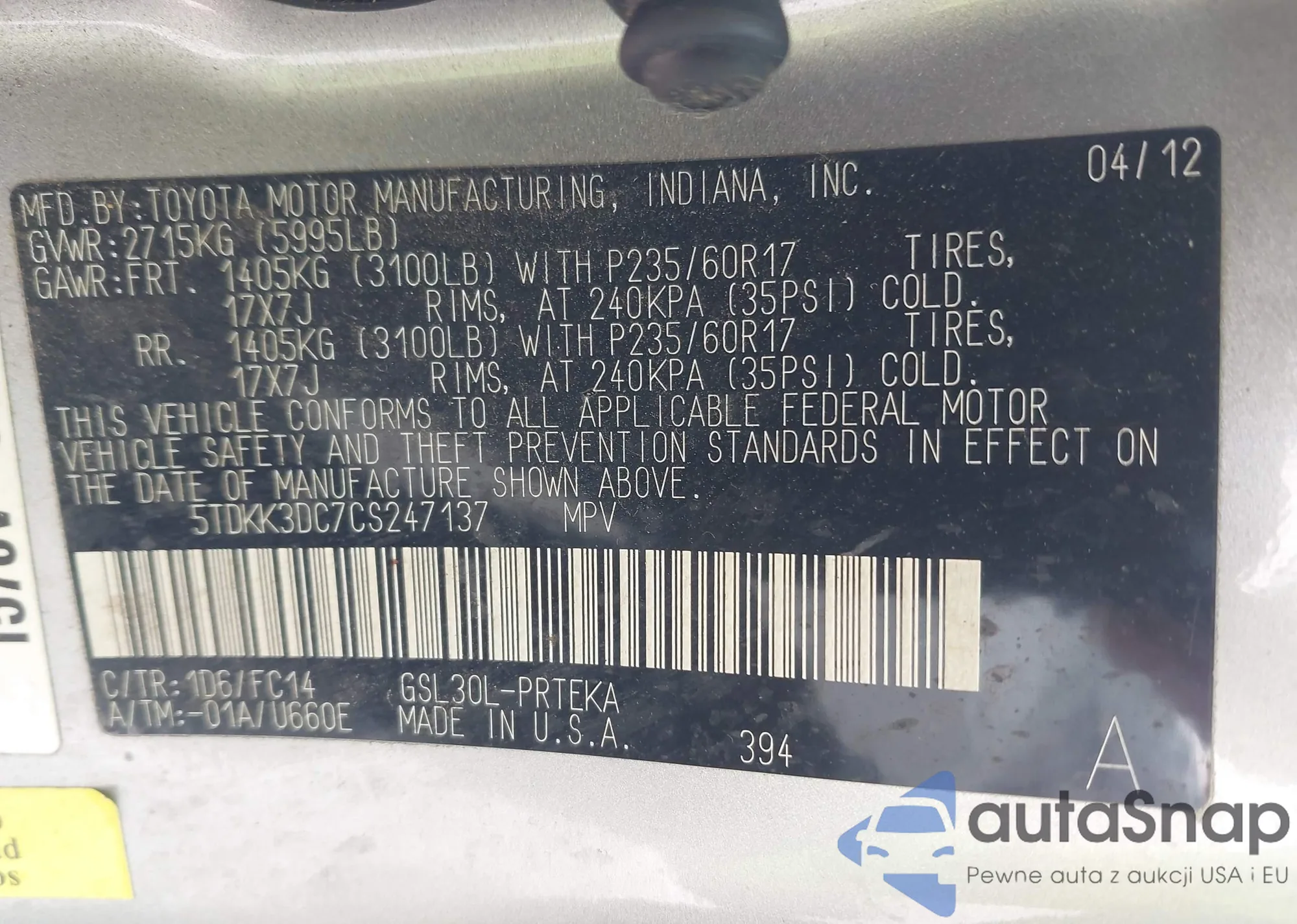 LOT: 42064875 VIN: 5TDKK3DC7CS247137