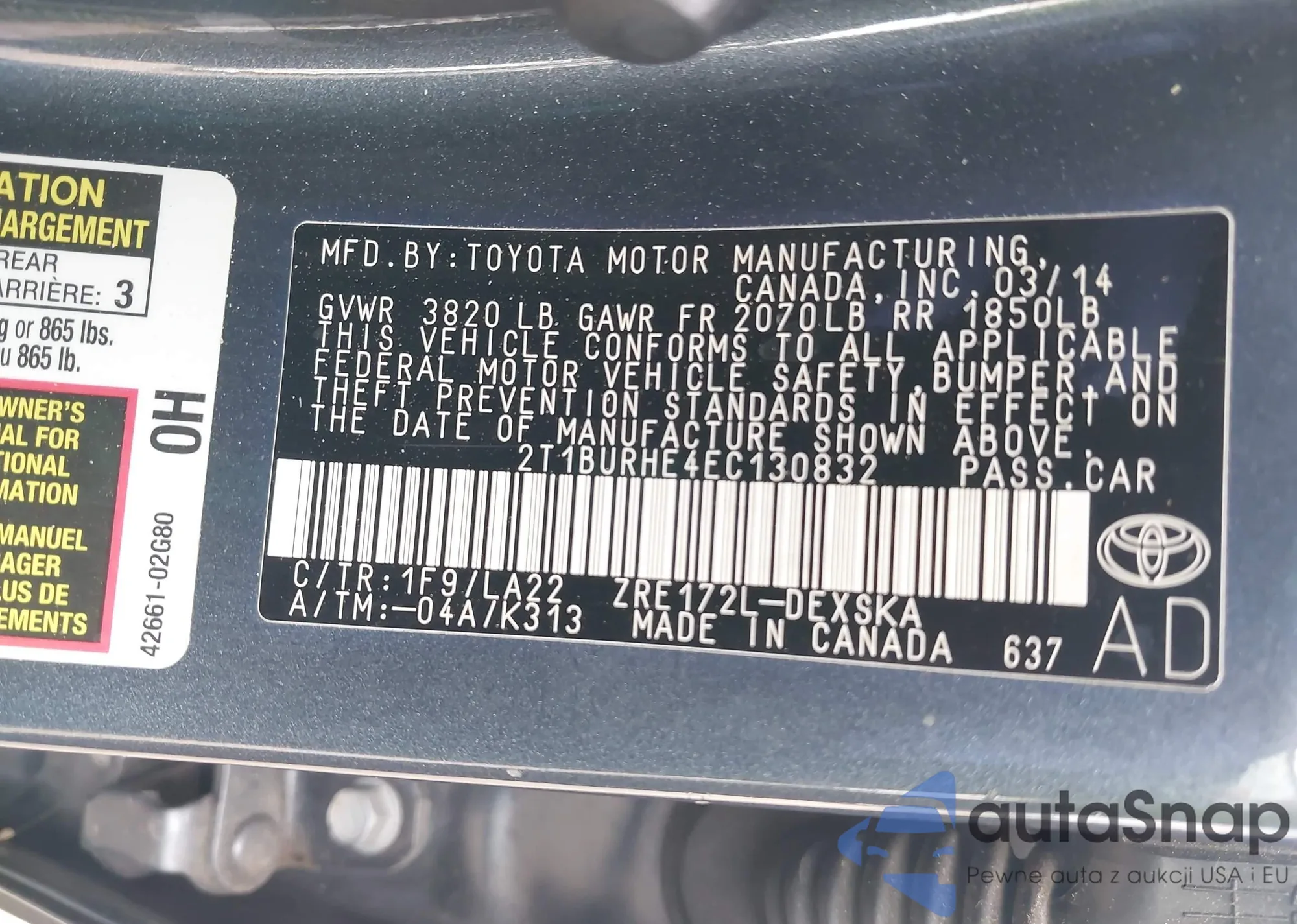 LOT: 43193047 VIN: 2T1BURHE4EC130832