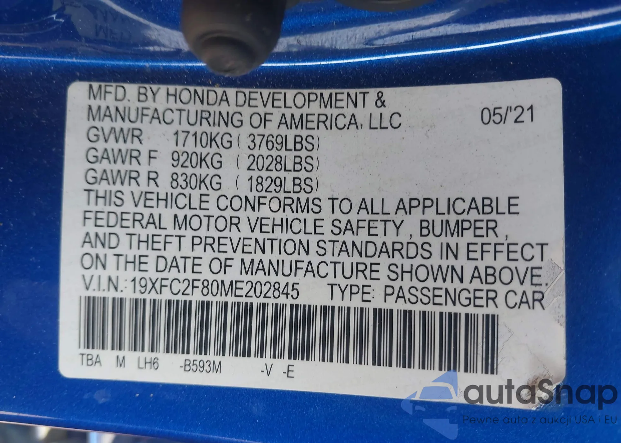 • VIN 19XFC2F80ME202845