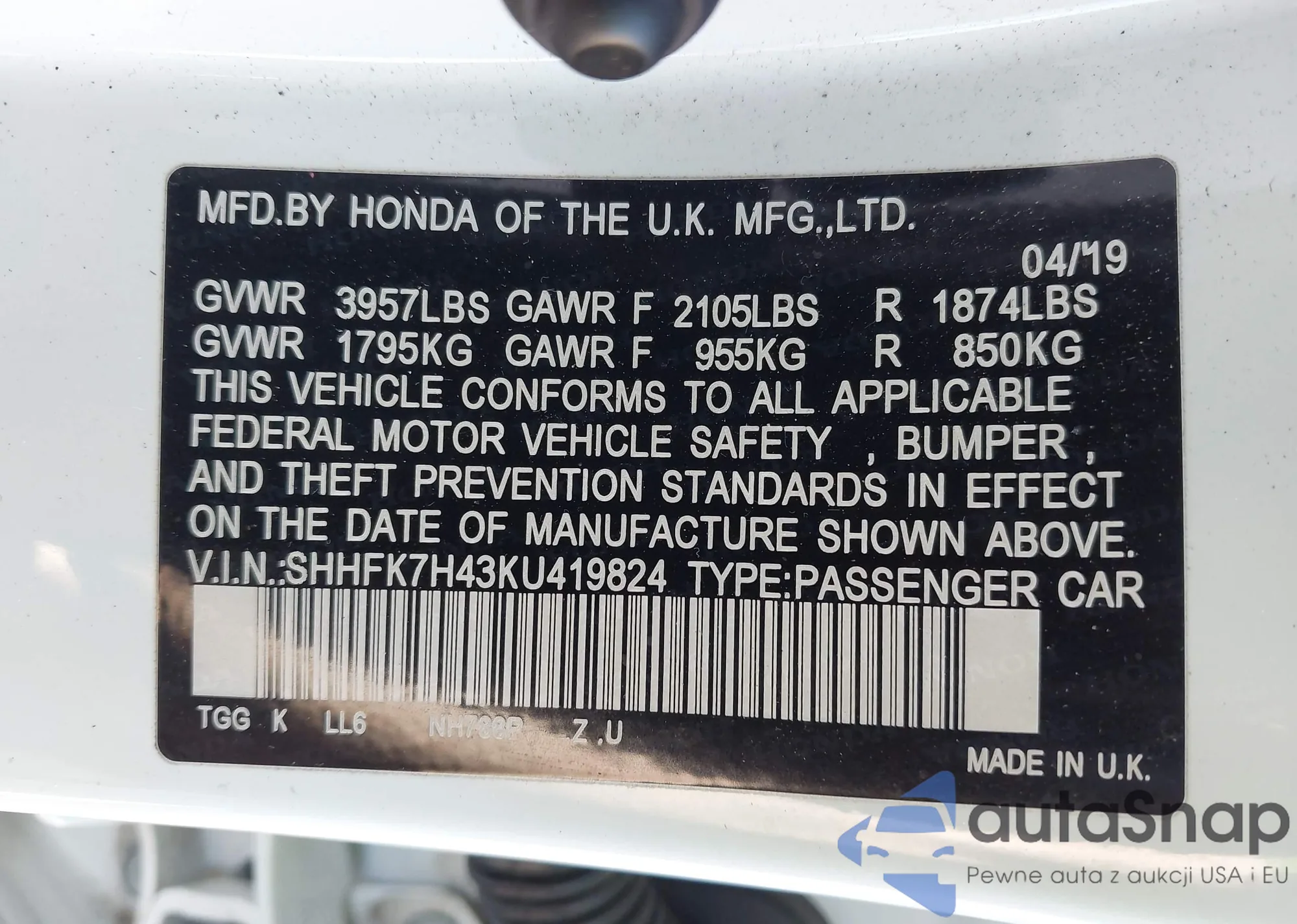 LOT: 43320533 VIN: SHHFK7H43KU419824