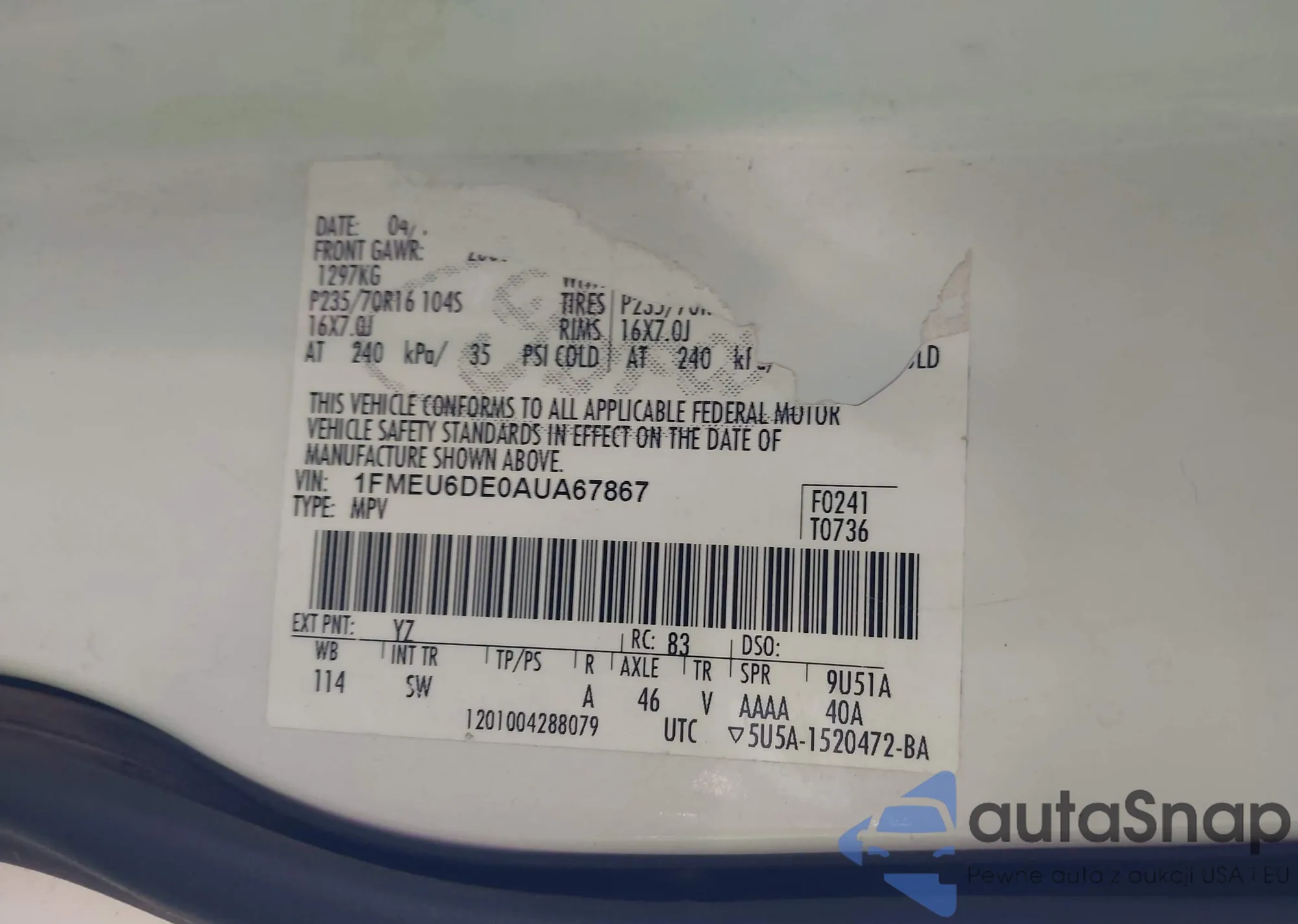 • VIN 1FMEU6DE0AUA67867