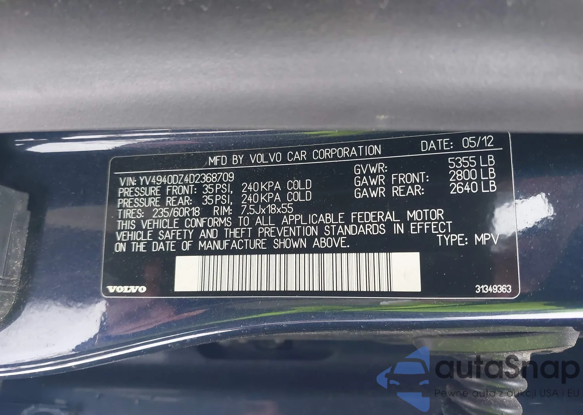 LOT: 43531921 VIN: YV4940DZ4D2368709