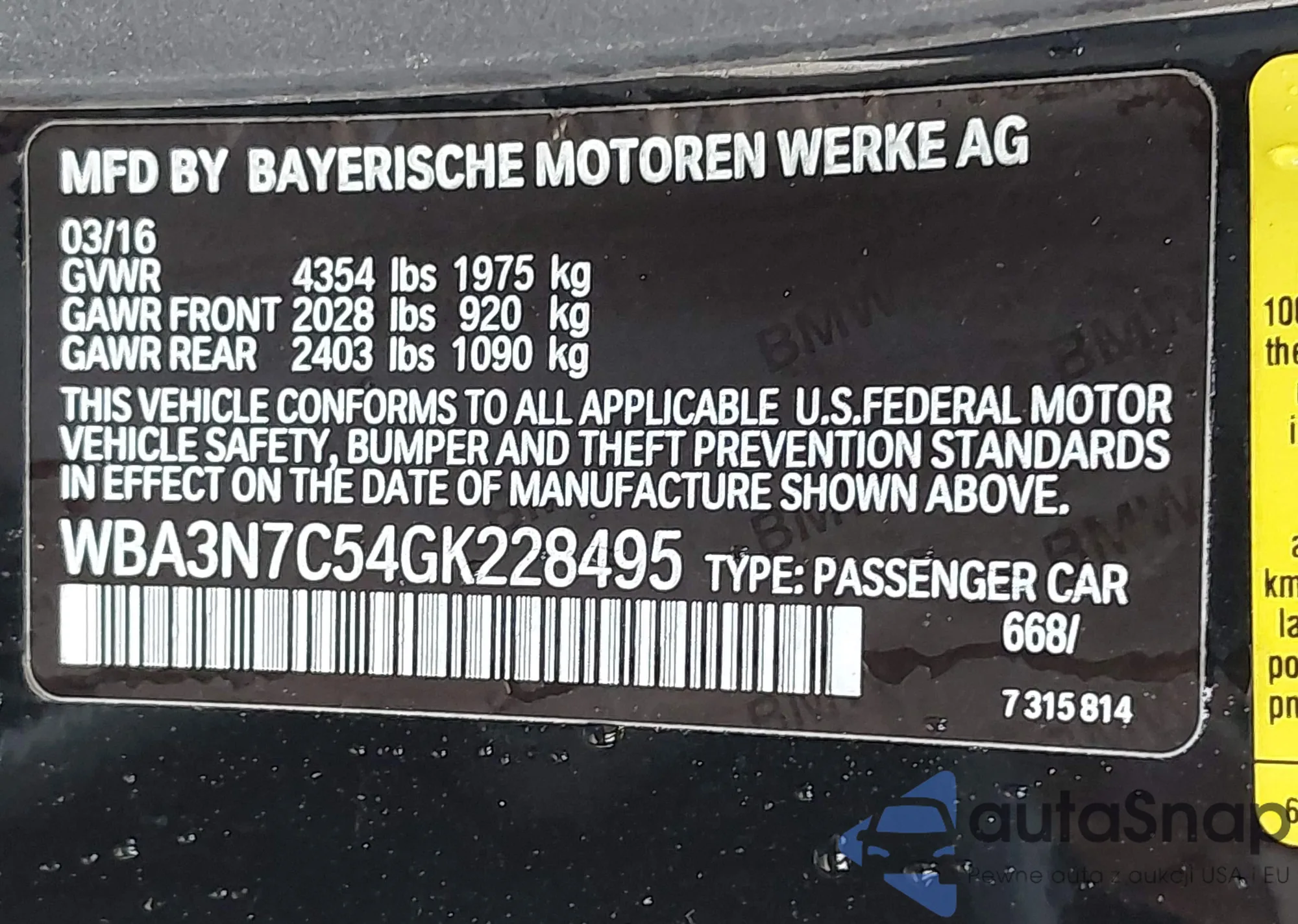 LOT: 43396953 VIN: WBA3N7C54GK228495