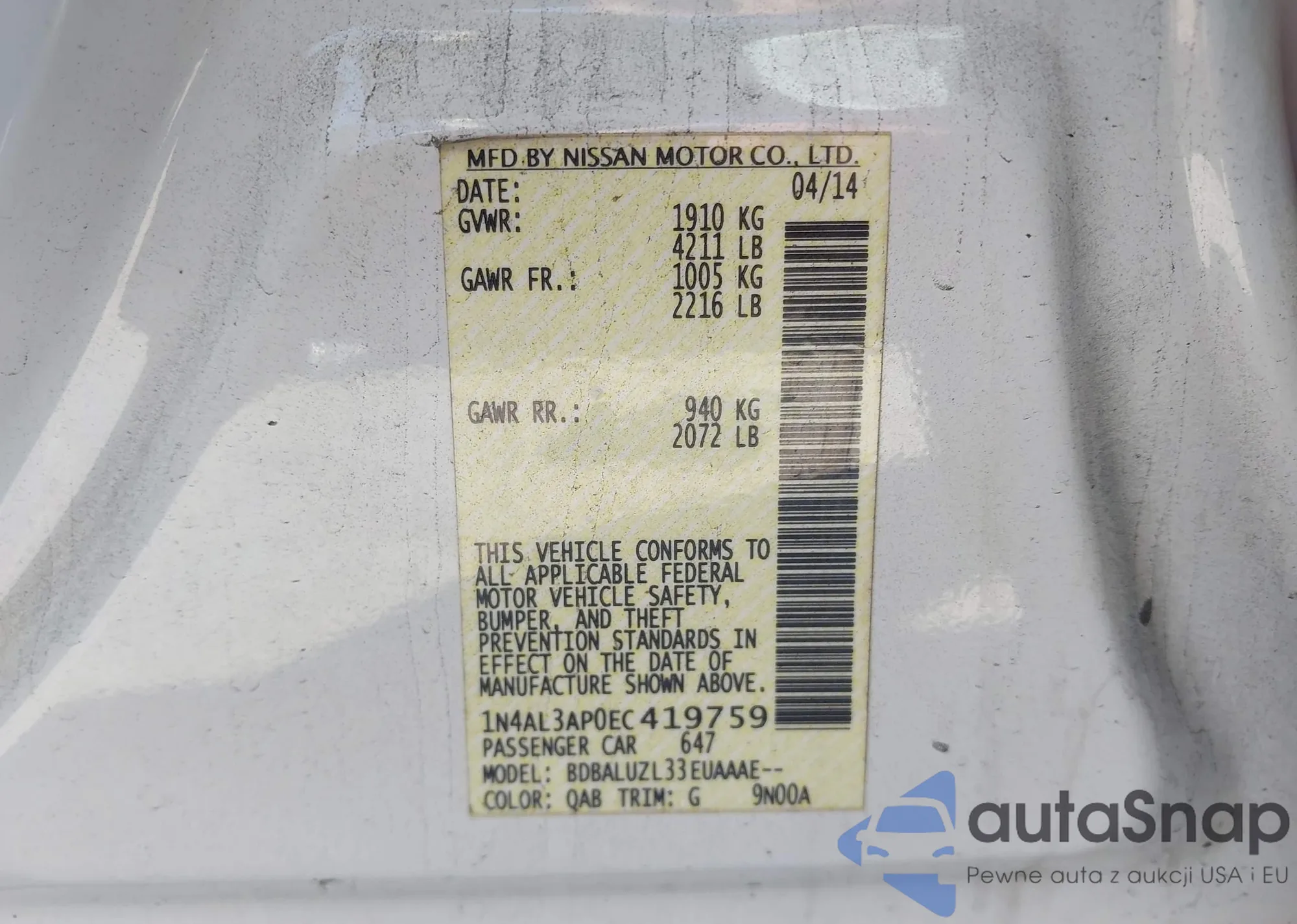 LOT: 44117216 VIN: 1N4AL3AP0EC419759