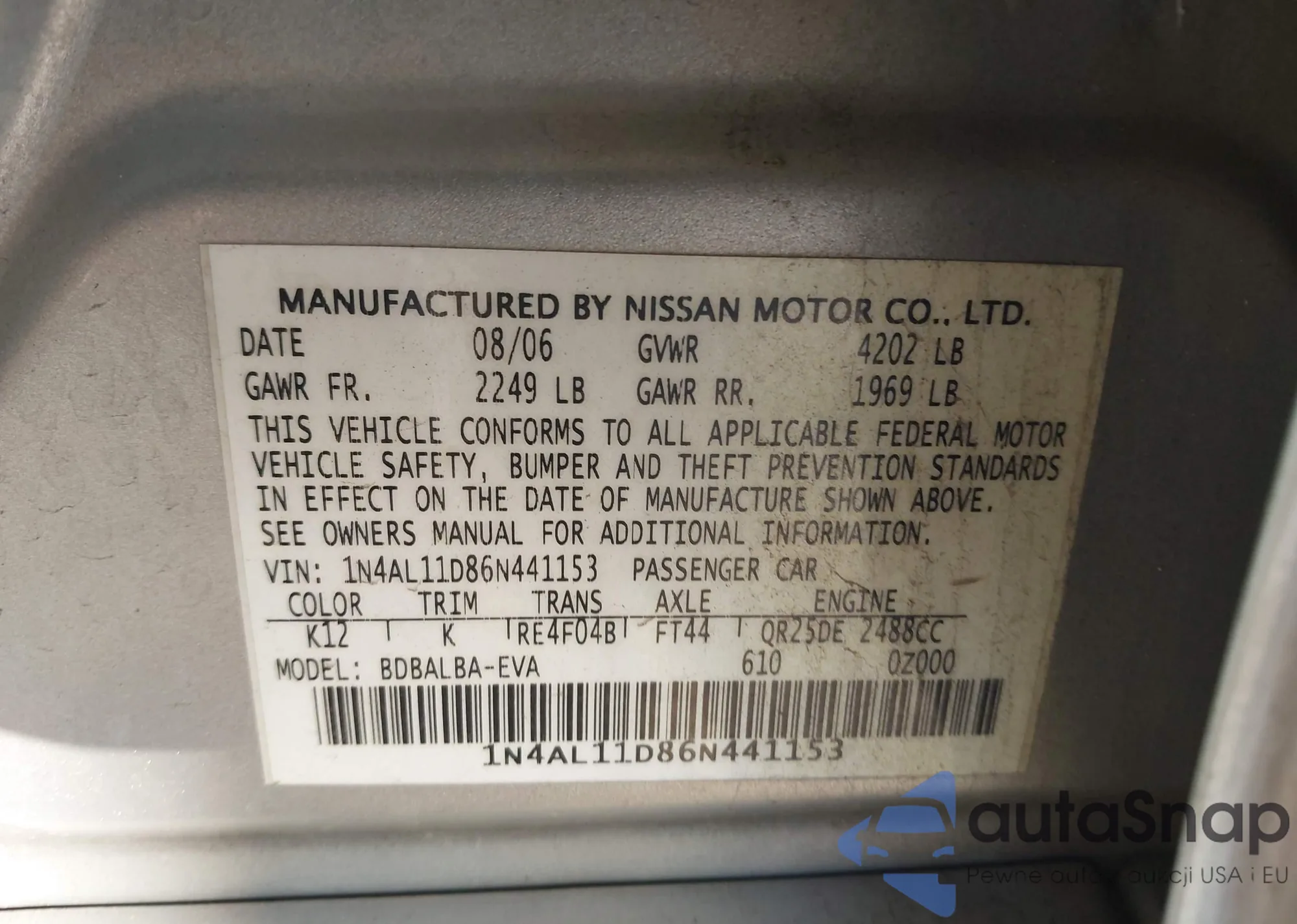 • VIN 1N4AL11D86N441153