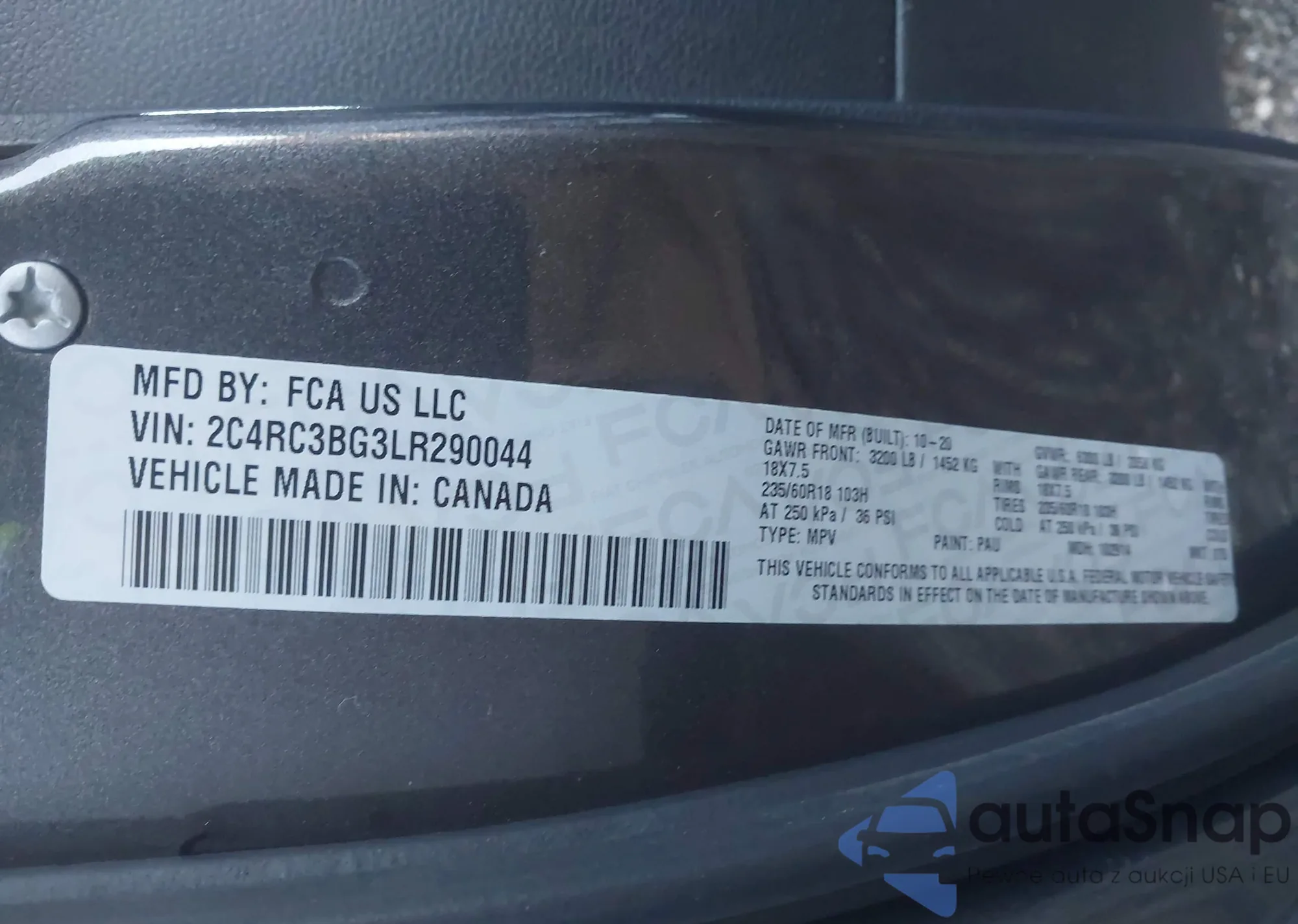 LOT: 44132487 VIN: 2C4RC3BG3LR290044