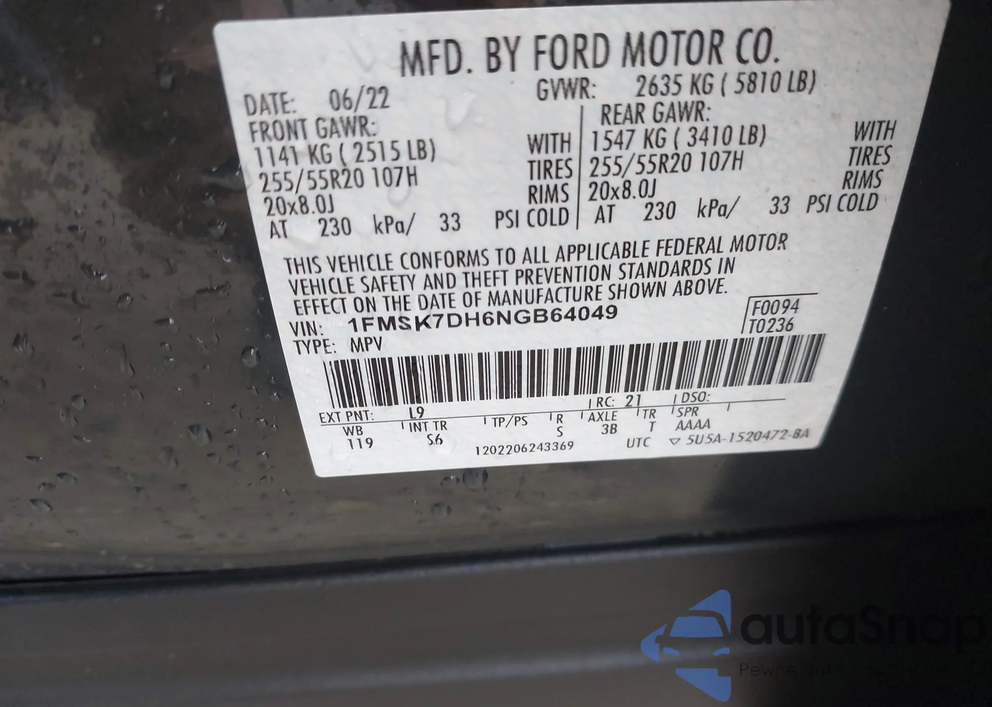 LOT: 43874860 VIN: 1FMSK7DH6NGB64049