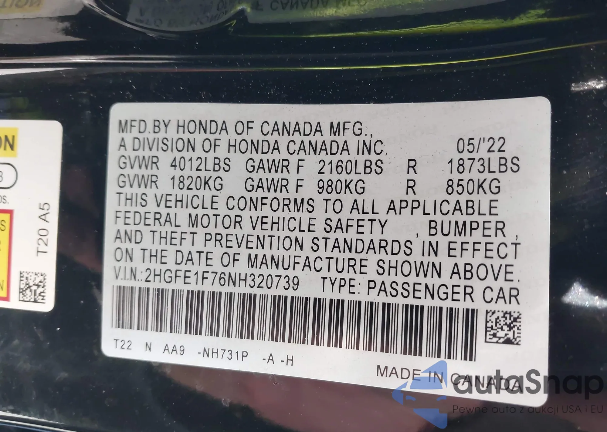 LOT: 44025655 VIN: 2HGFE1F76NH320739
