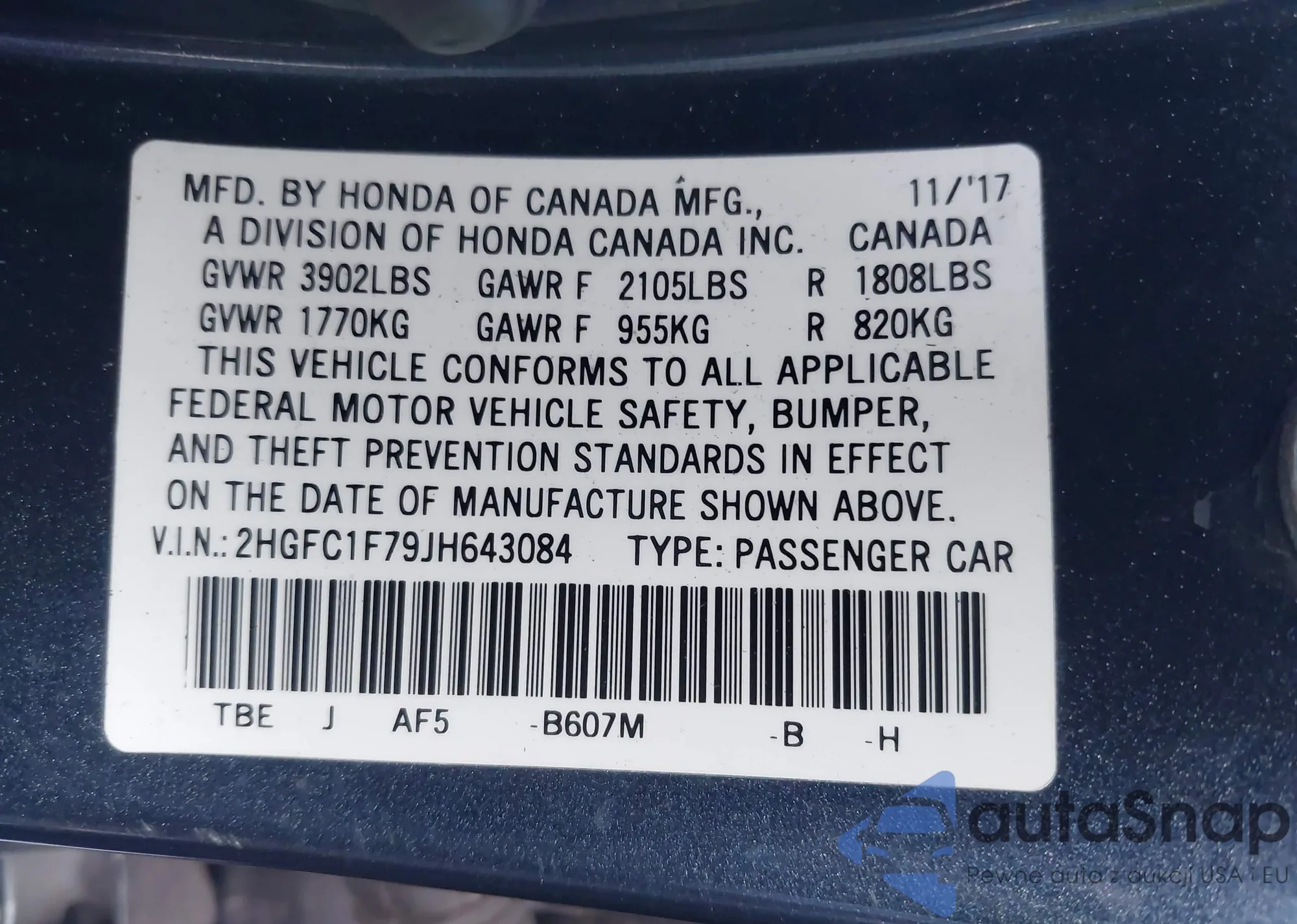 • VIN 2HGFC1F79JH643084