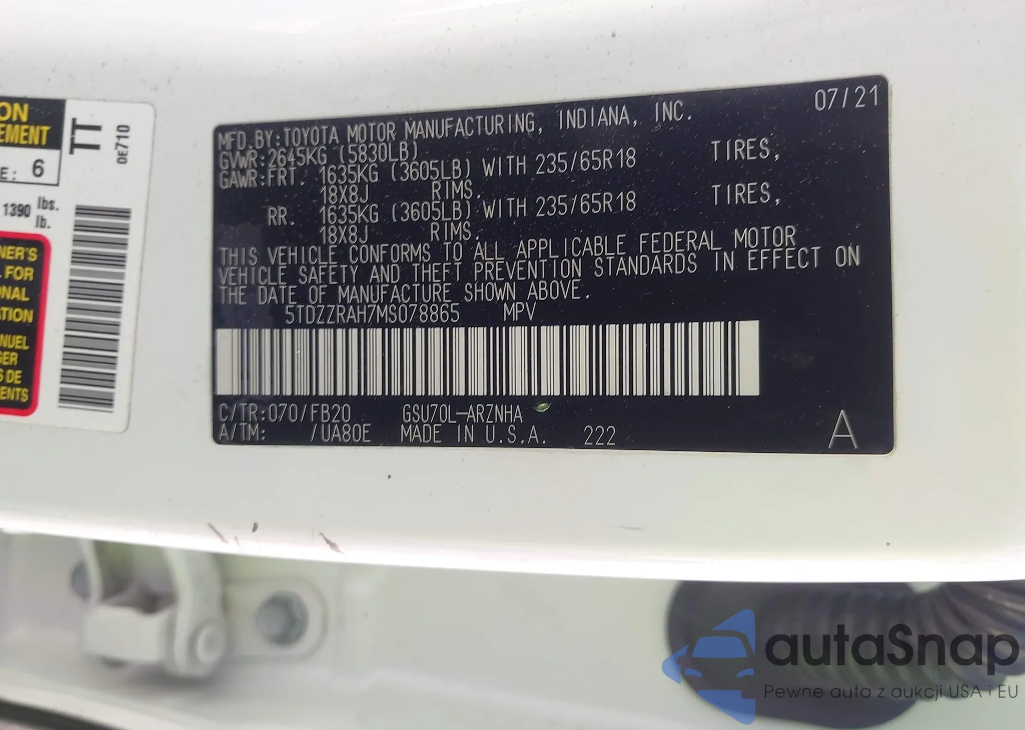 LOT: 44097312 VIN: 5TDZZRAH7MS078865