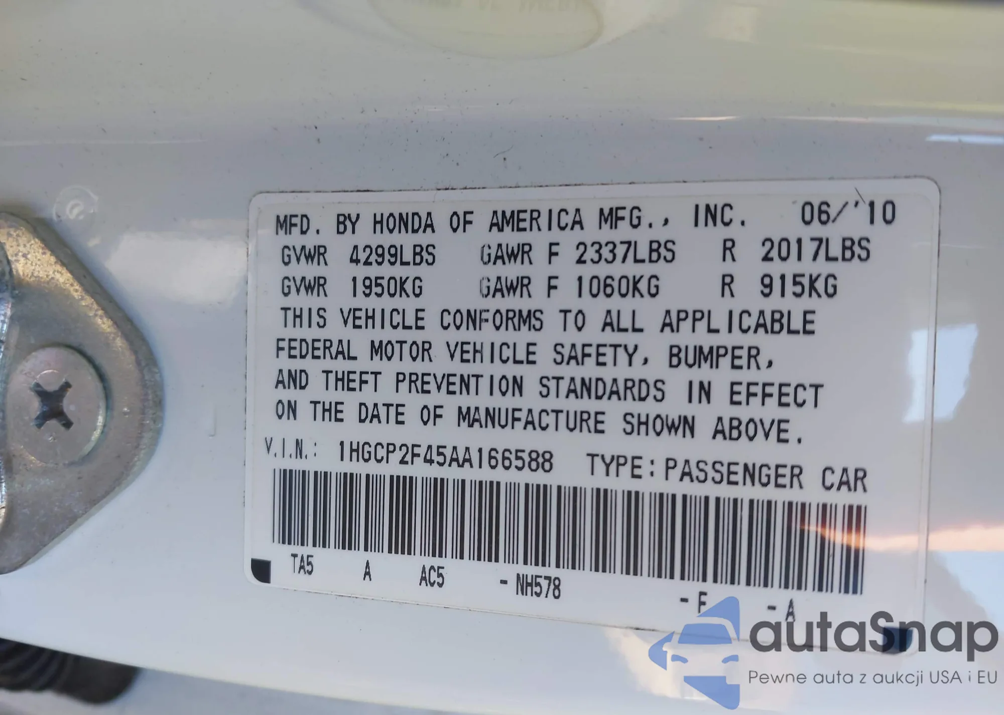 LOT: 43966664 VIN: 1HGCP2F45AA166588