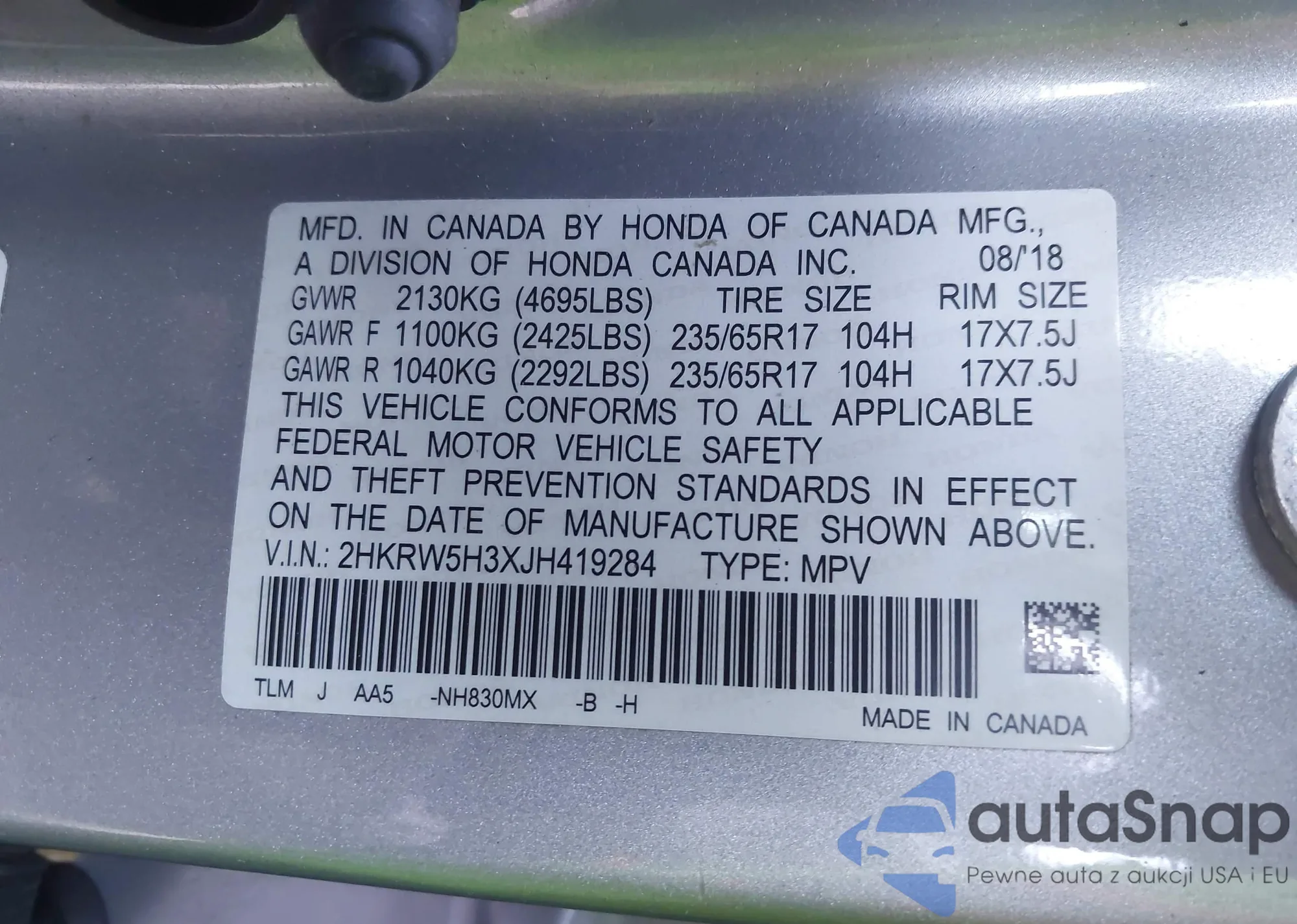 • VIN 2HKRW5H3XJH419284