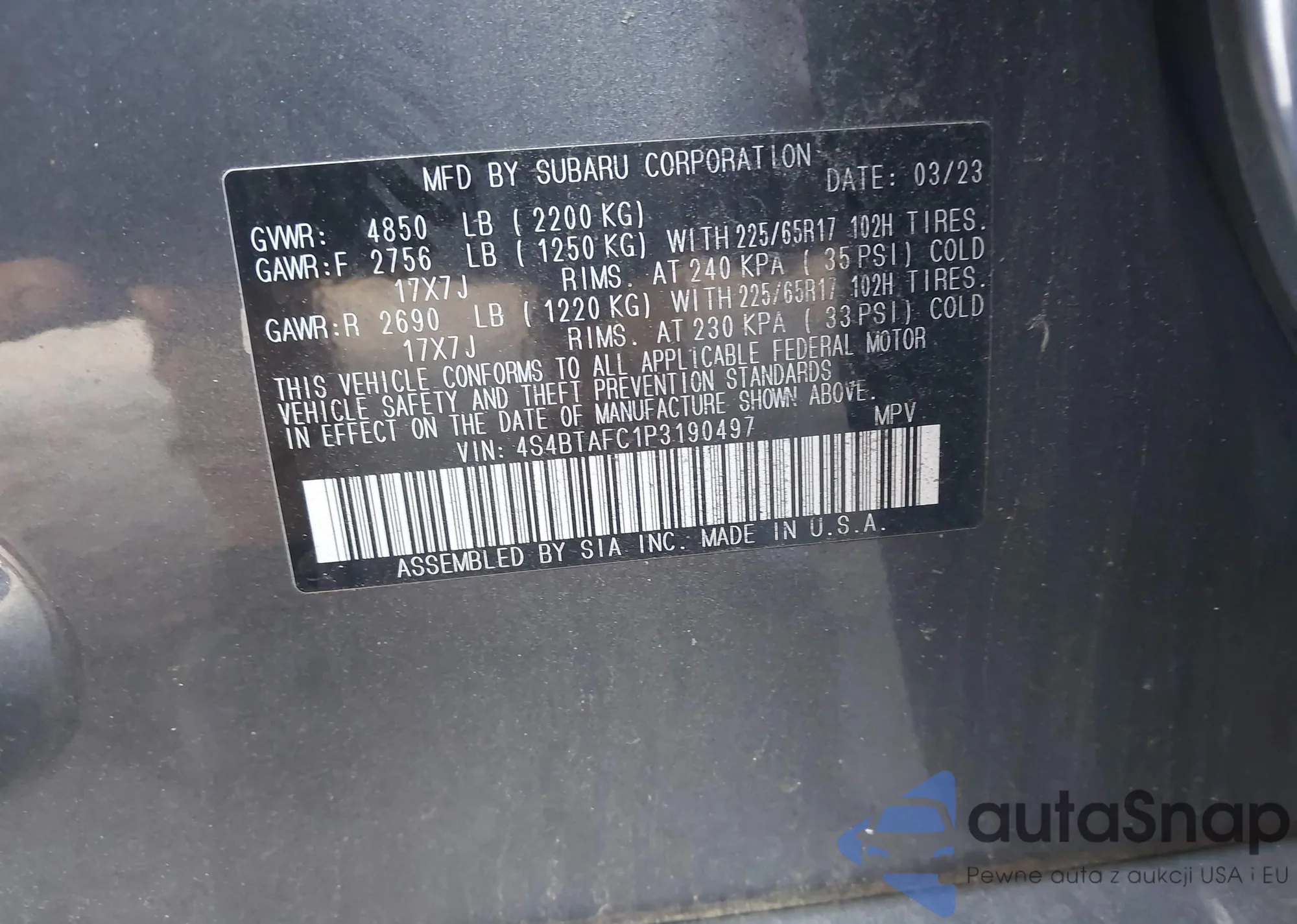 • VIN 4S4BTAFC1P3190497