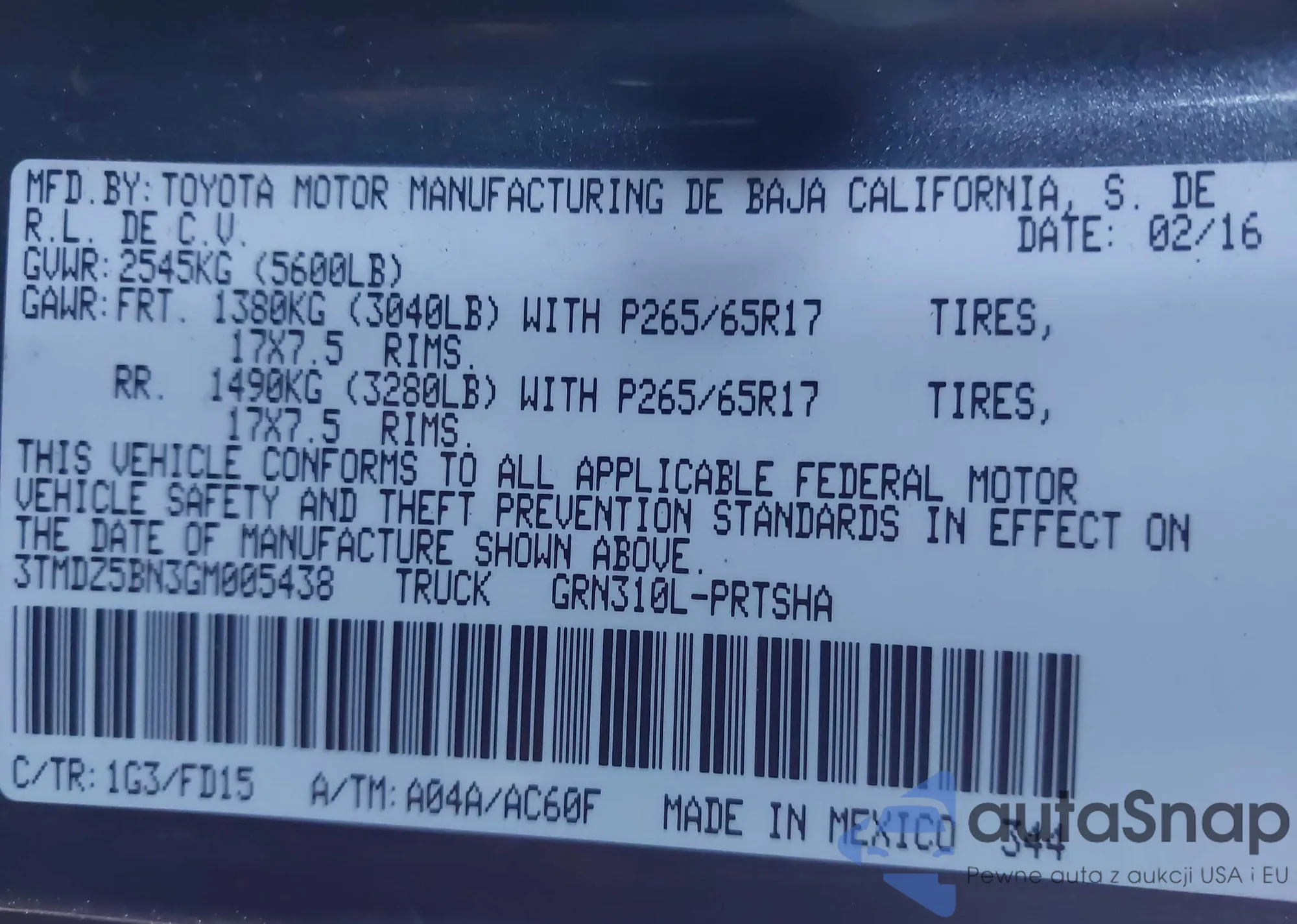 • VIN 3TMDZ5BN3GM005438
