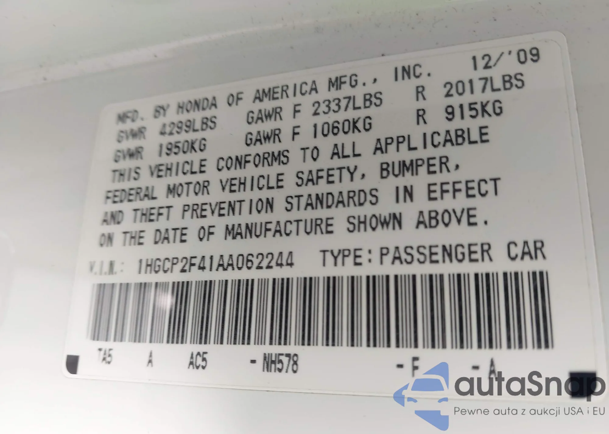 LOT: 44006384 VIN: 1HGCP2F41AA062244