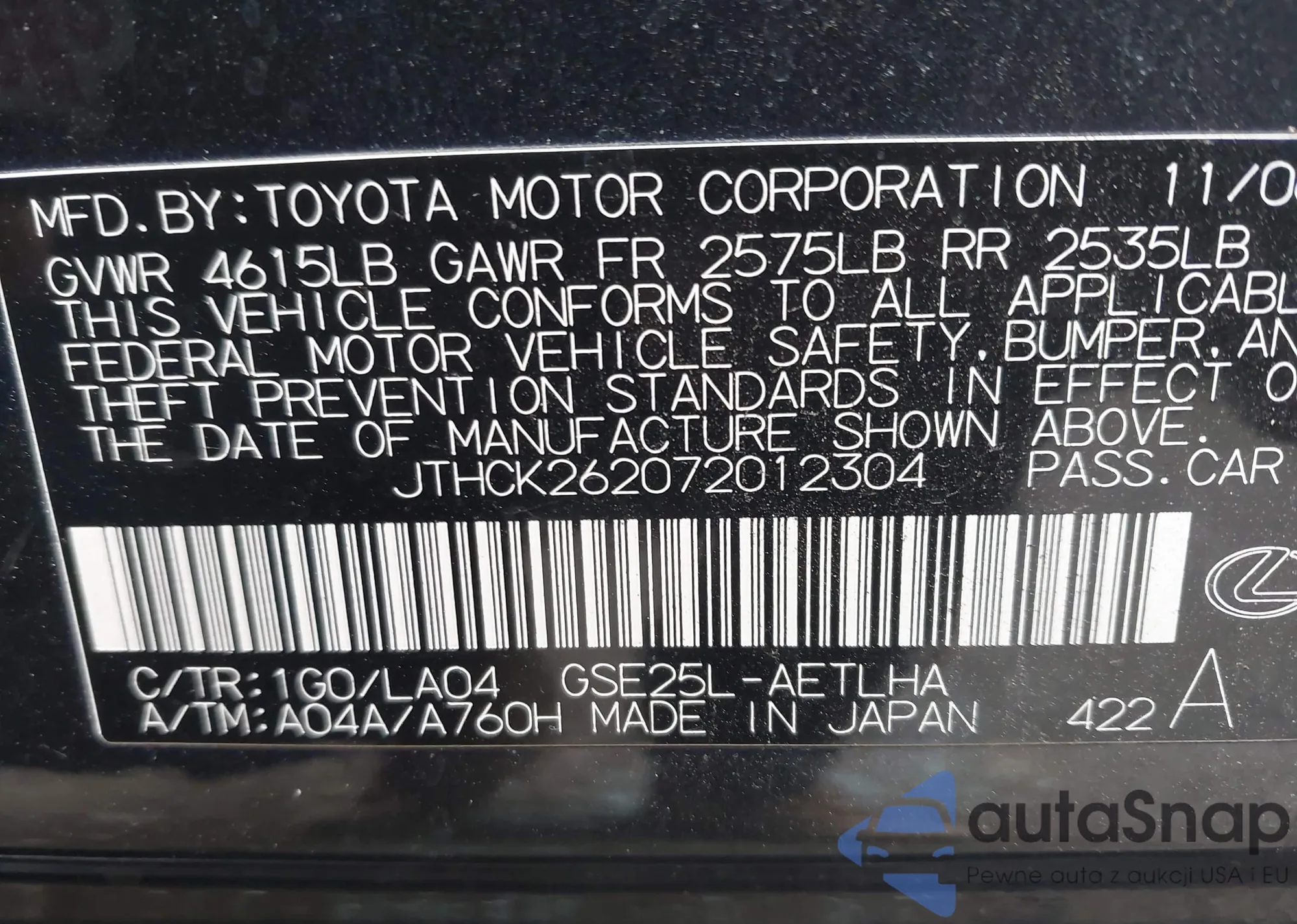 LOT: 43922178 VIN: JTHGZ1E28P5028581
