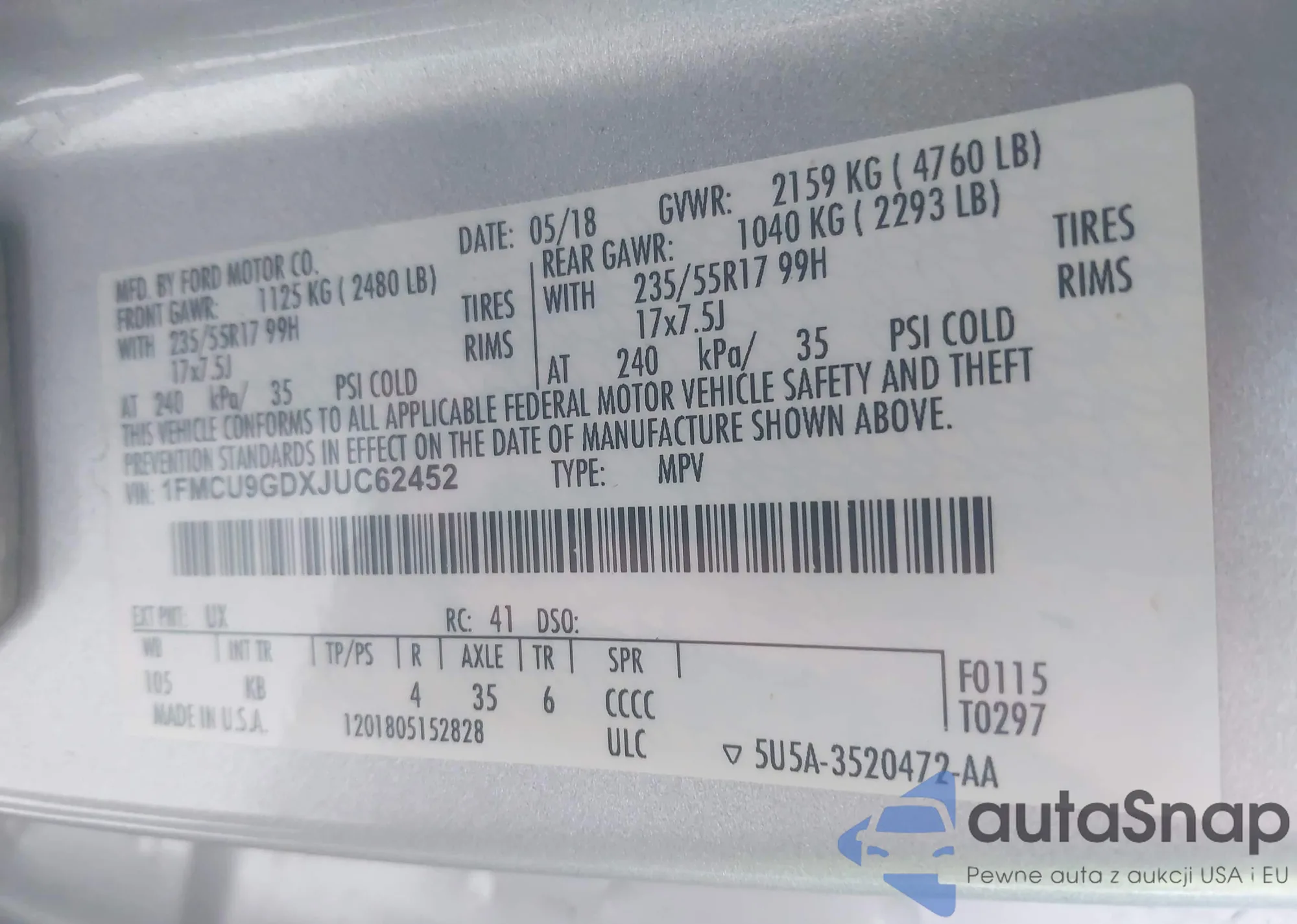 • VIN 1FMCU9GDXJUC62452