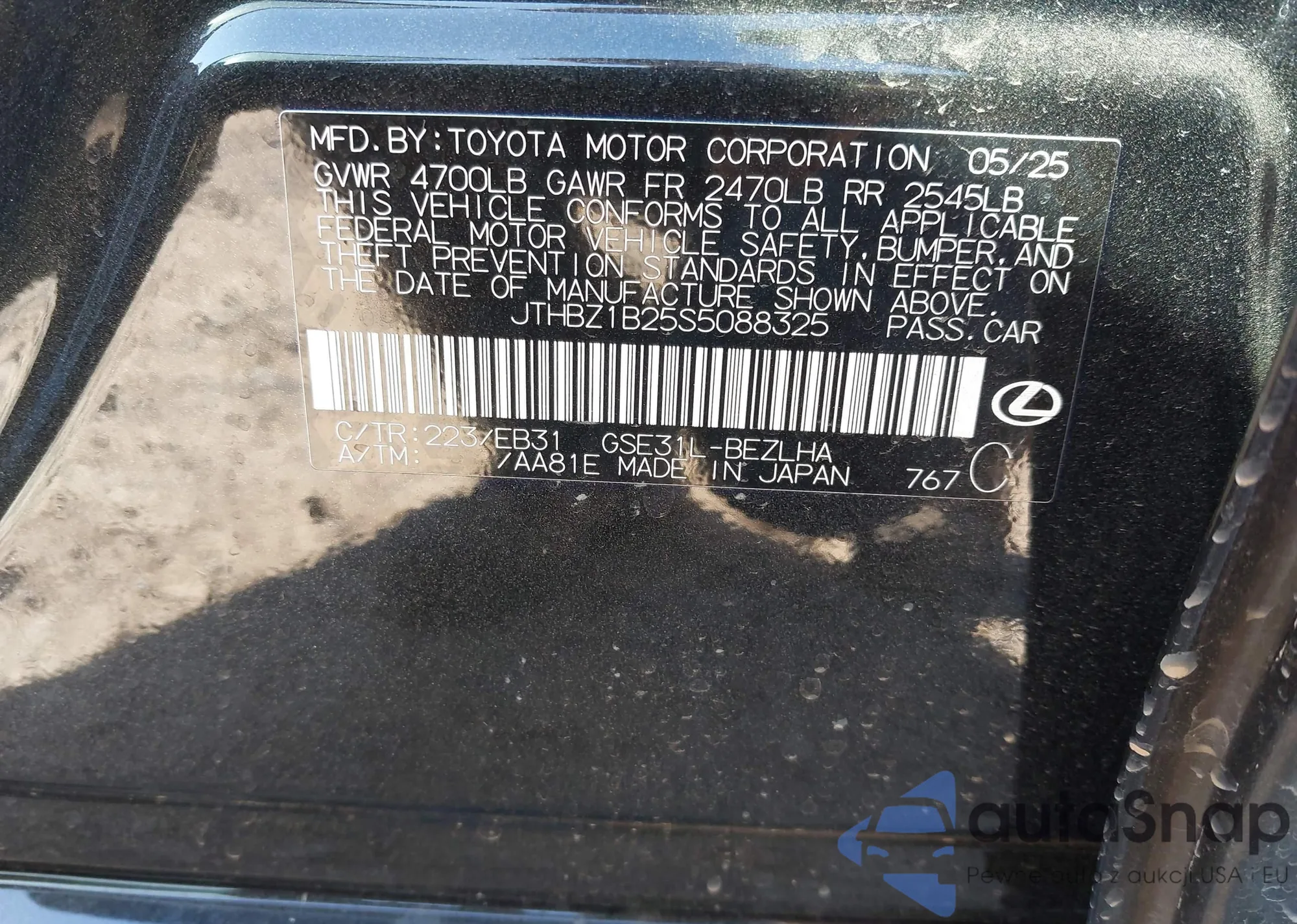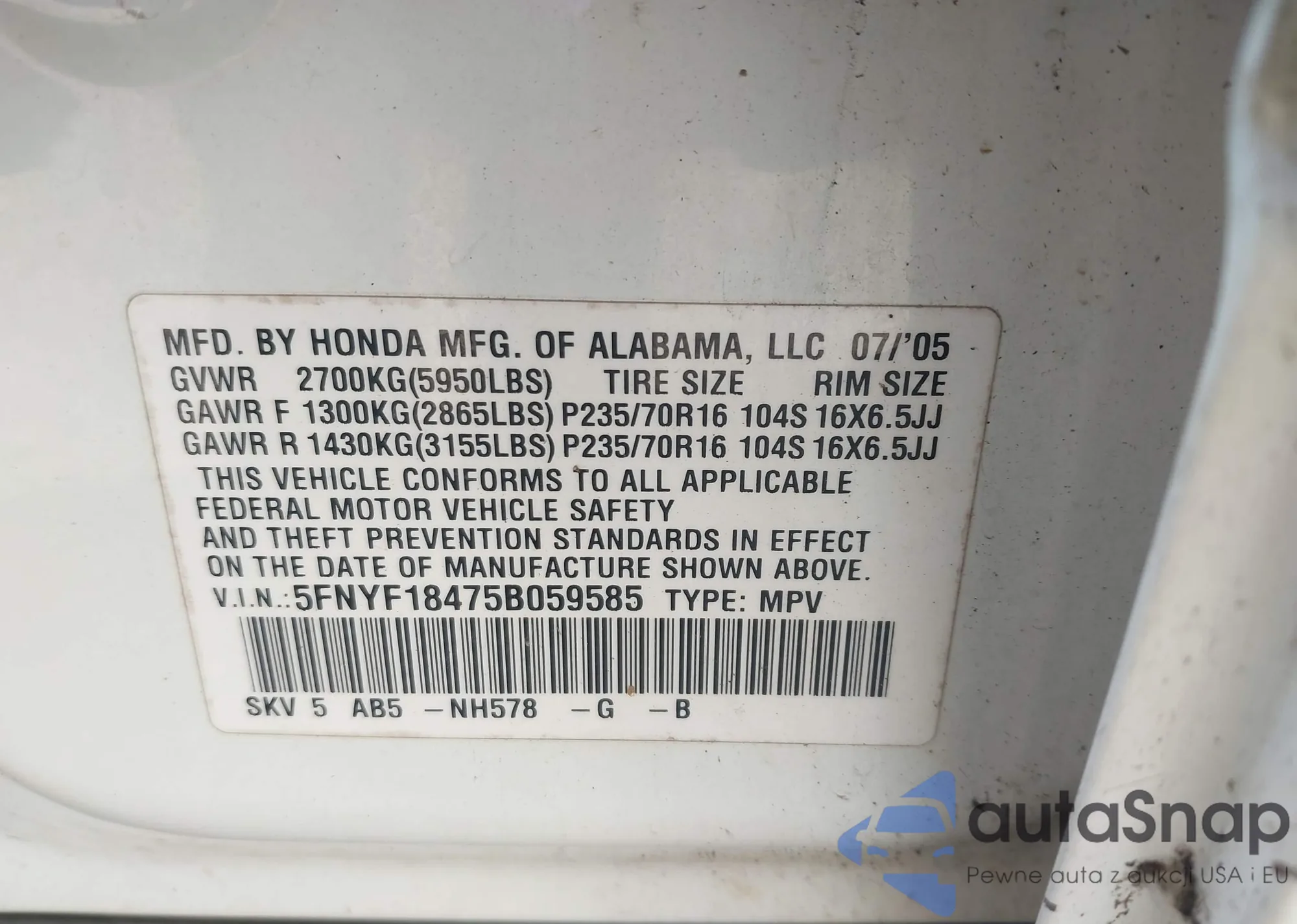 LOT: 43589984 VIN: 5FNYF18475B059585
