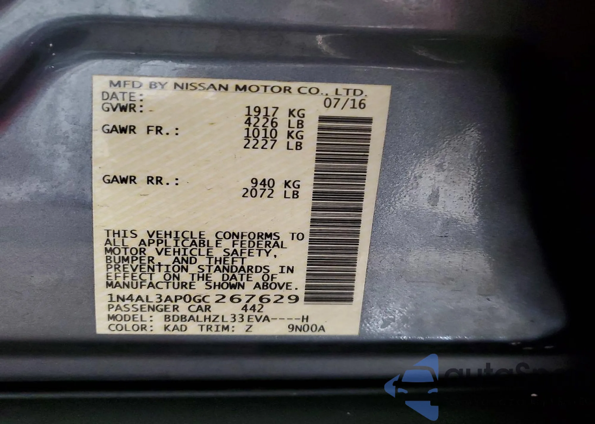 • VIN 1N4AL3AP0GC267629