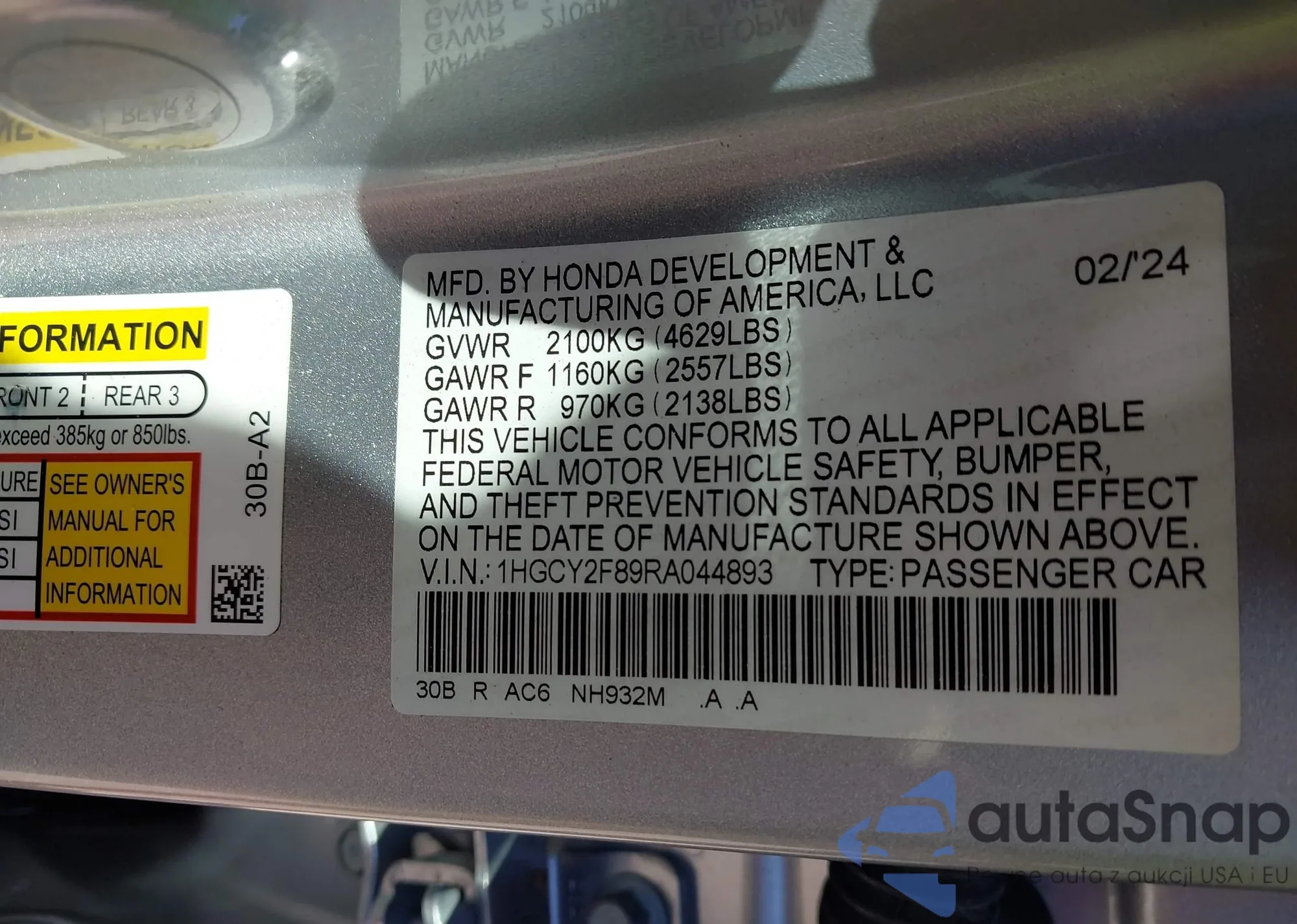 • VIN 1HGCY2F89RA044893