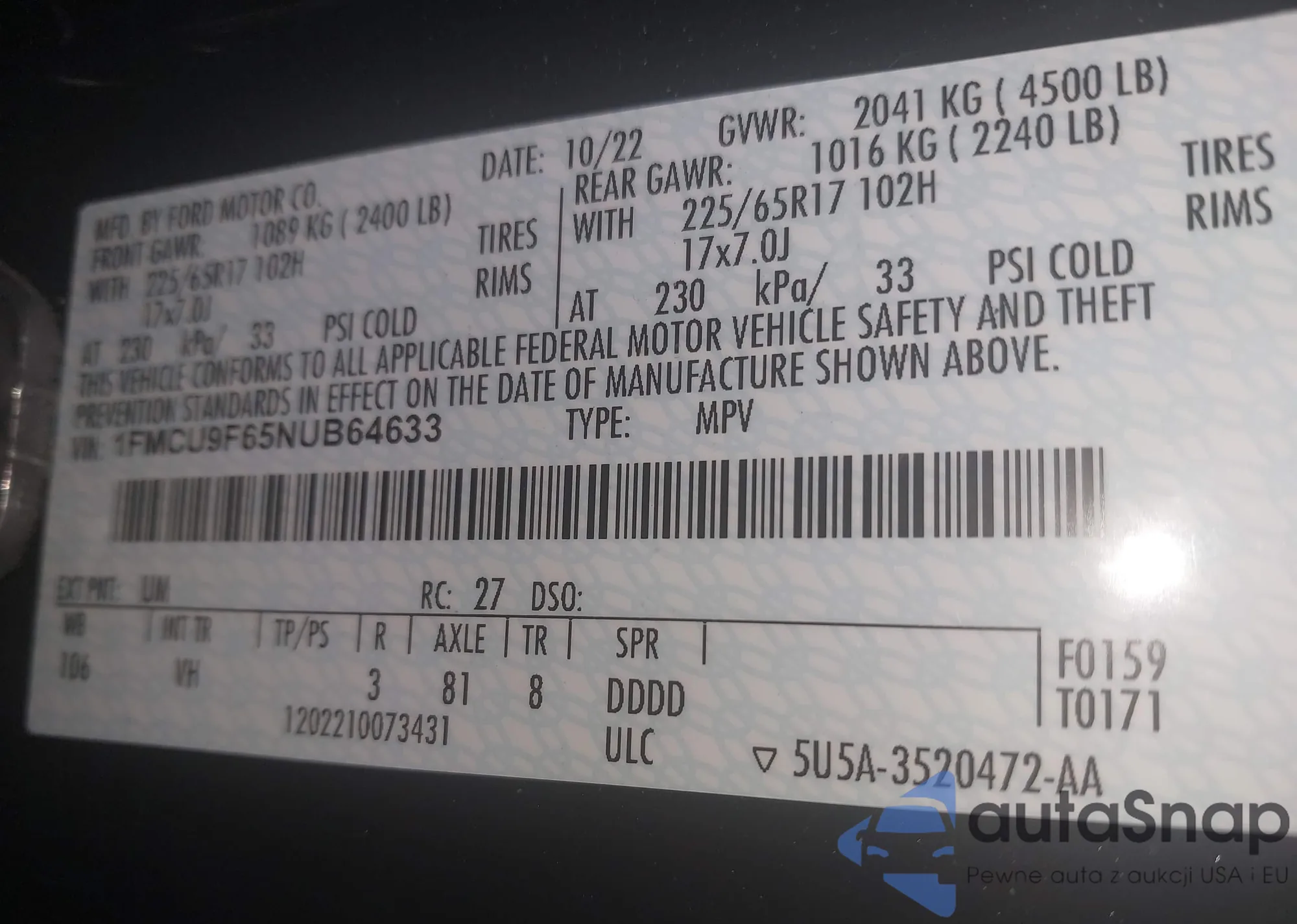 • VIN 1FMCU9F65NUB64633