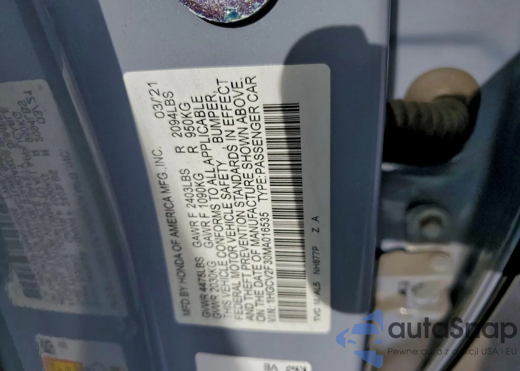 LOT: 94420545 VIN: 1HGCV2F30MA016535