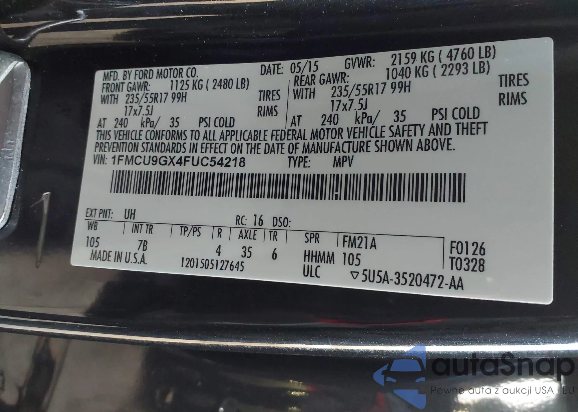 • VIN 1FMCU9GX4FUC54218