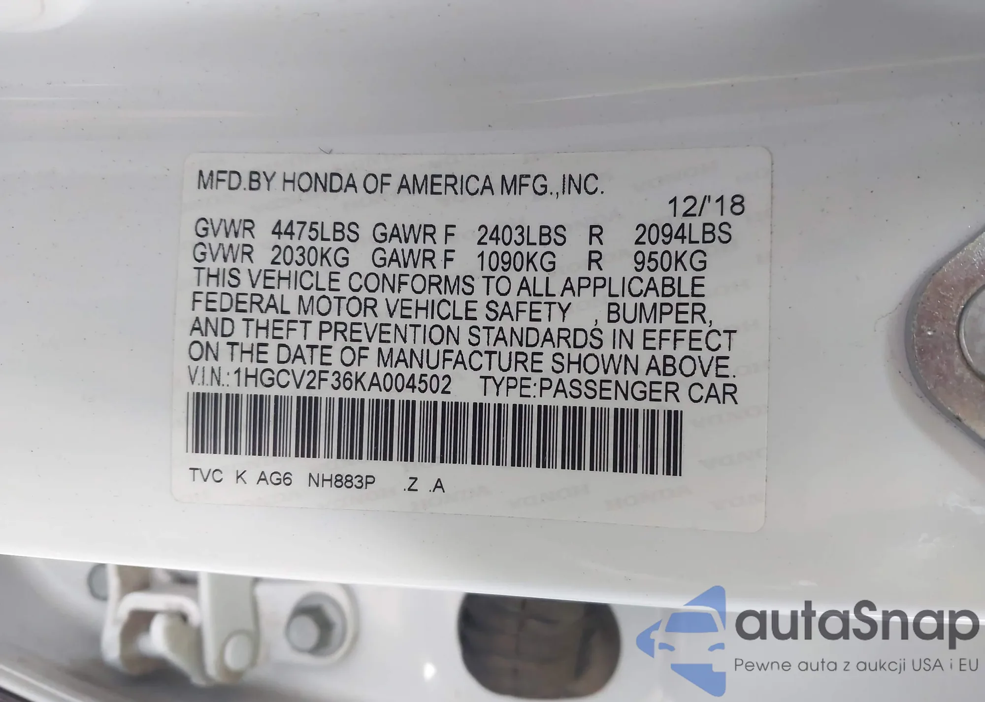 LOT: 43851800 VIN: 1HGCV2F36KA004502